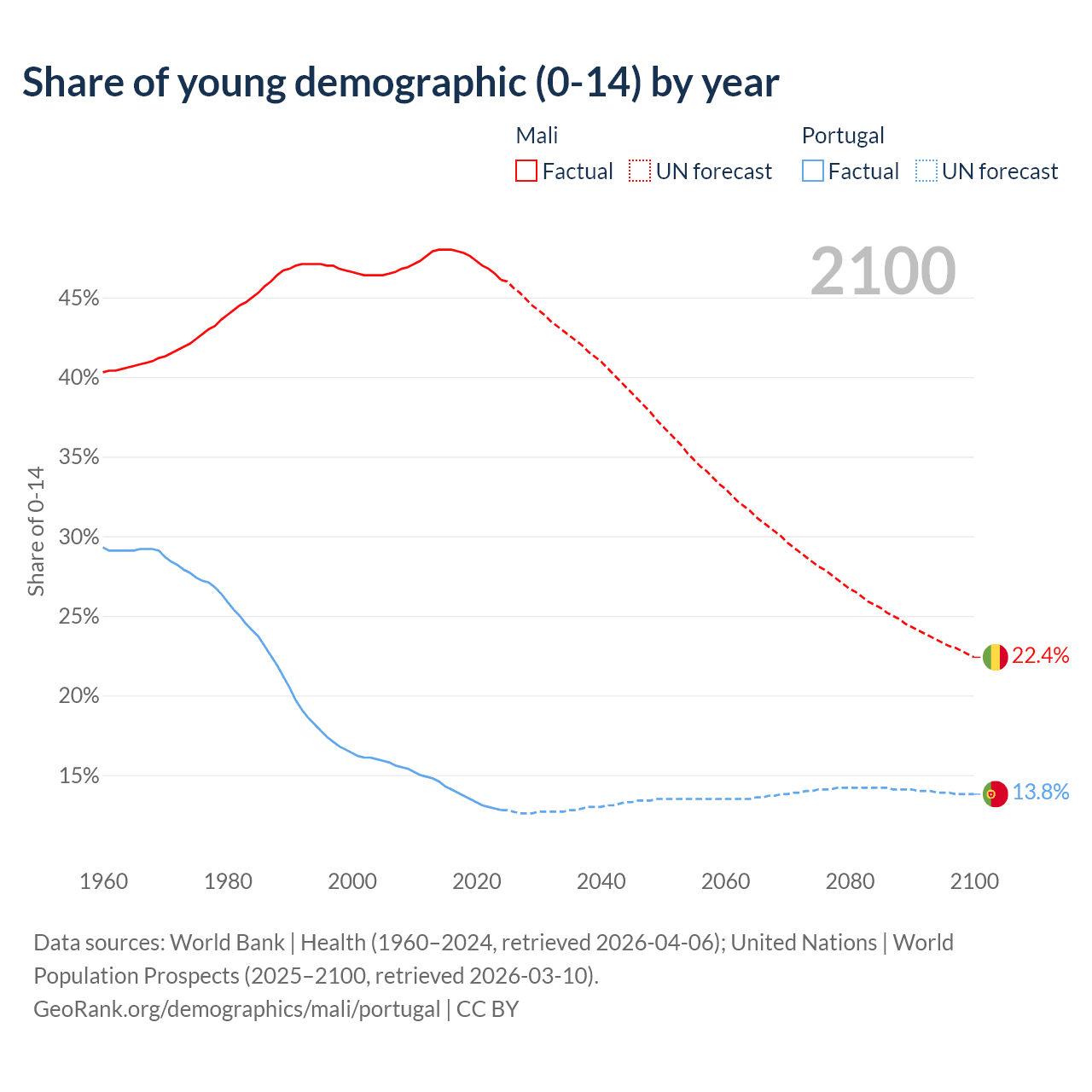 - The share of young demographic (0-15 years old) in Mali is 46.1% vs 12.8% in Portugal.