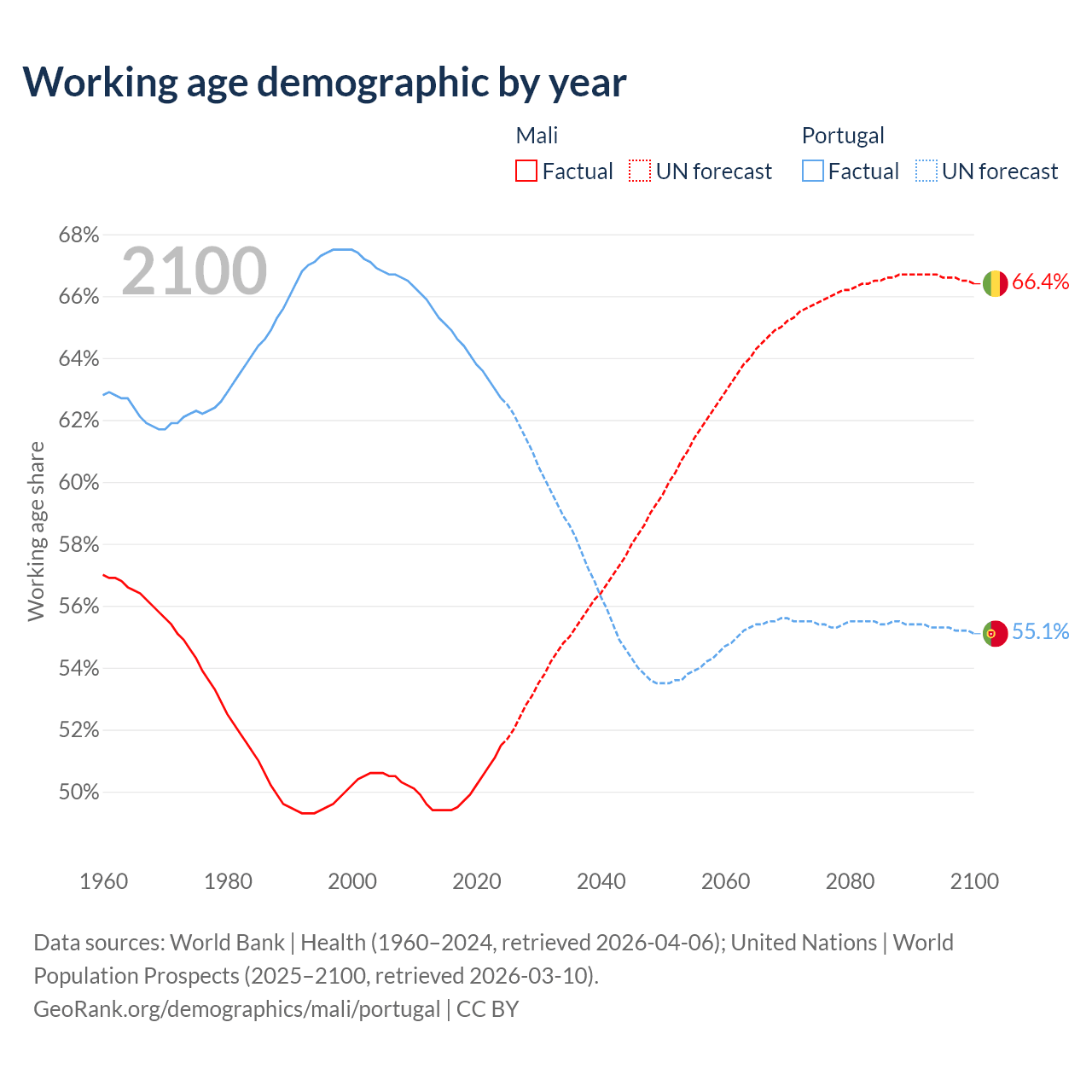 - Mali has 13.5M working age adults (aged 15-64) vs 6.68M in Portugal.