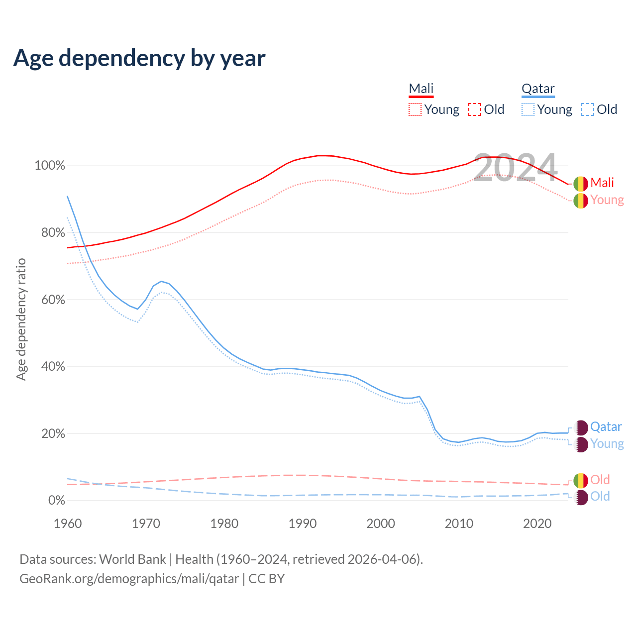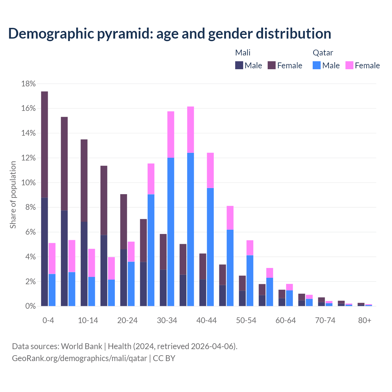 - Mali is ranked 193/196 by median age (oldest to youngest) vs 78/196 for Qatar.