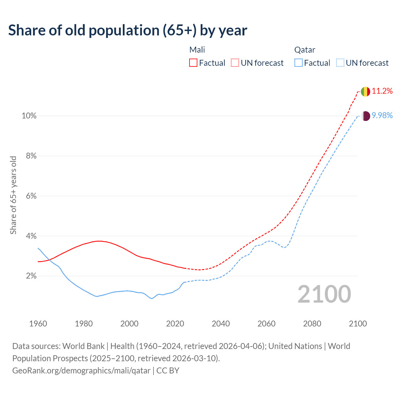 - The share of old-age demographic (65+) in Mali is 2.38% vs 1.68% in Qatar.