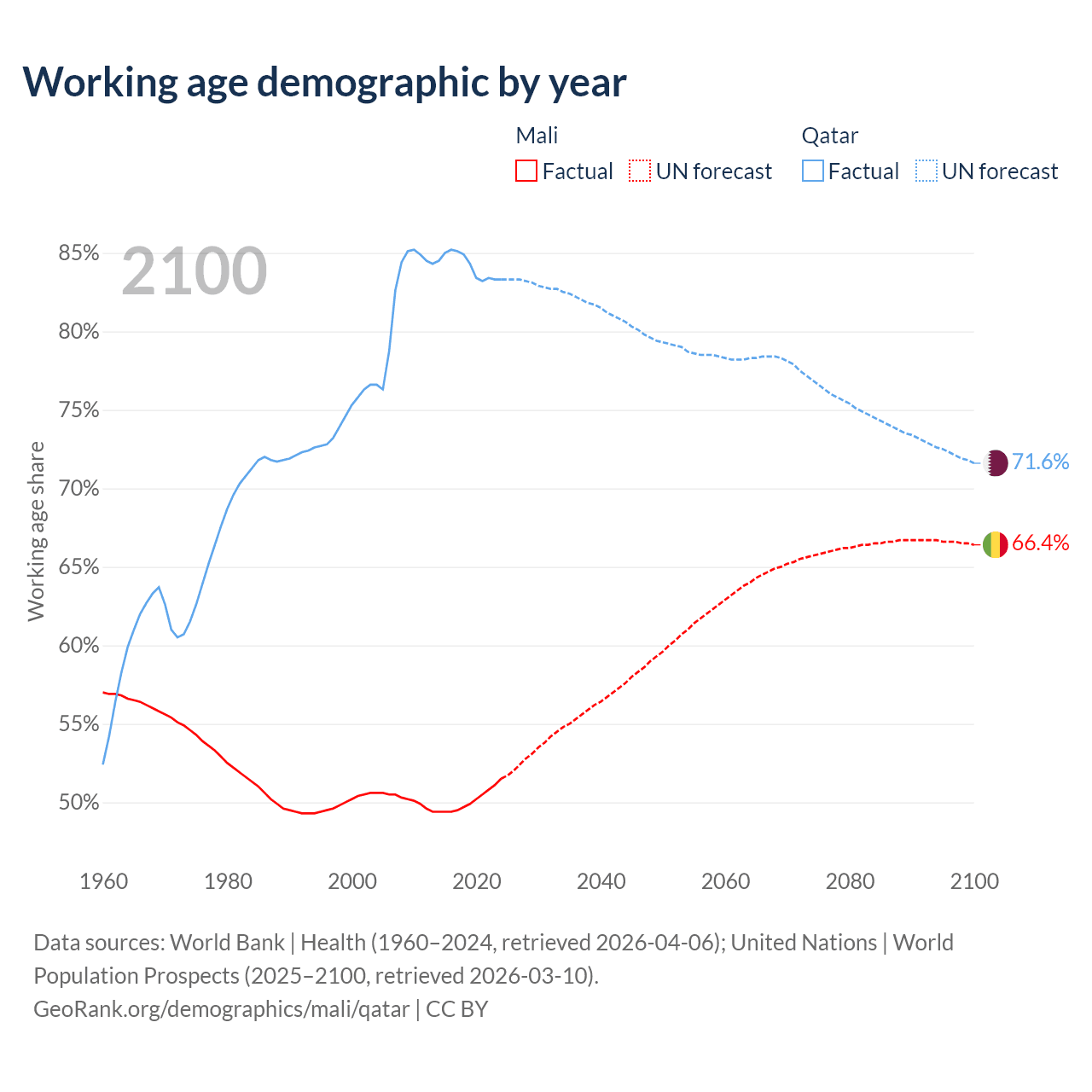 - Mali has 13.5M working age adults (aged 15-64) vs 2.5M in Qatar.