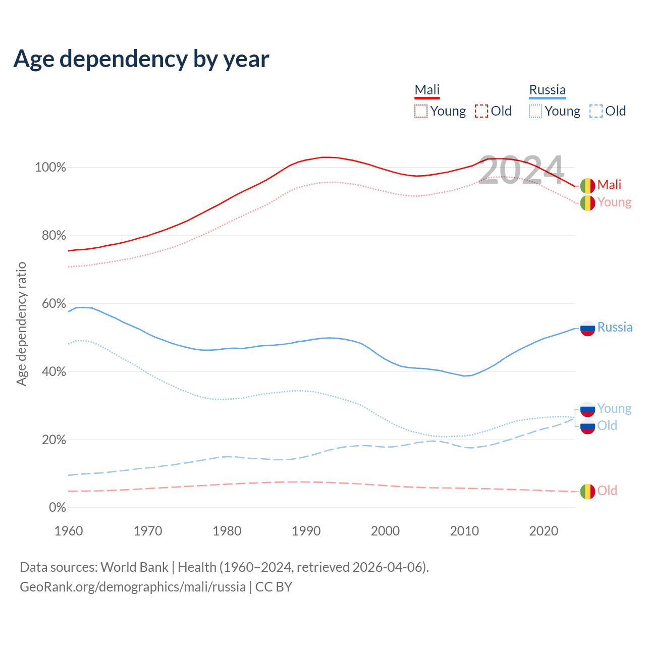 - Mali is ranked 193/196 by median age (oldest to youngest) vs 42/196 for Russia.