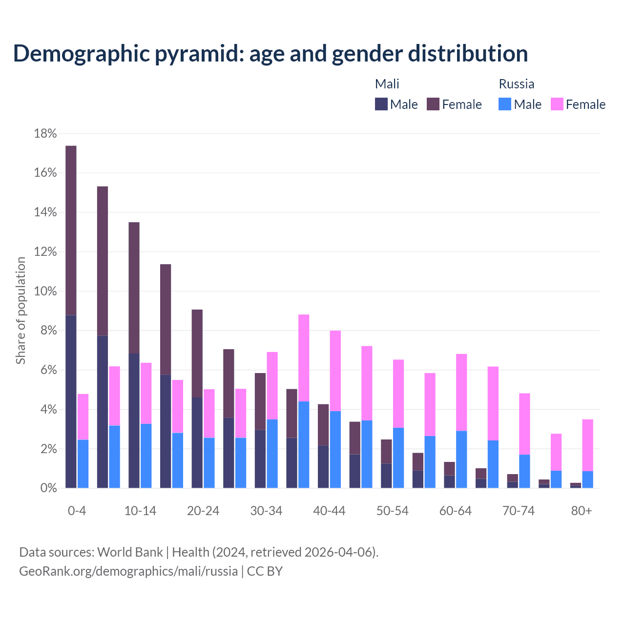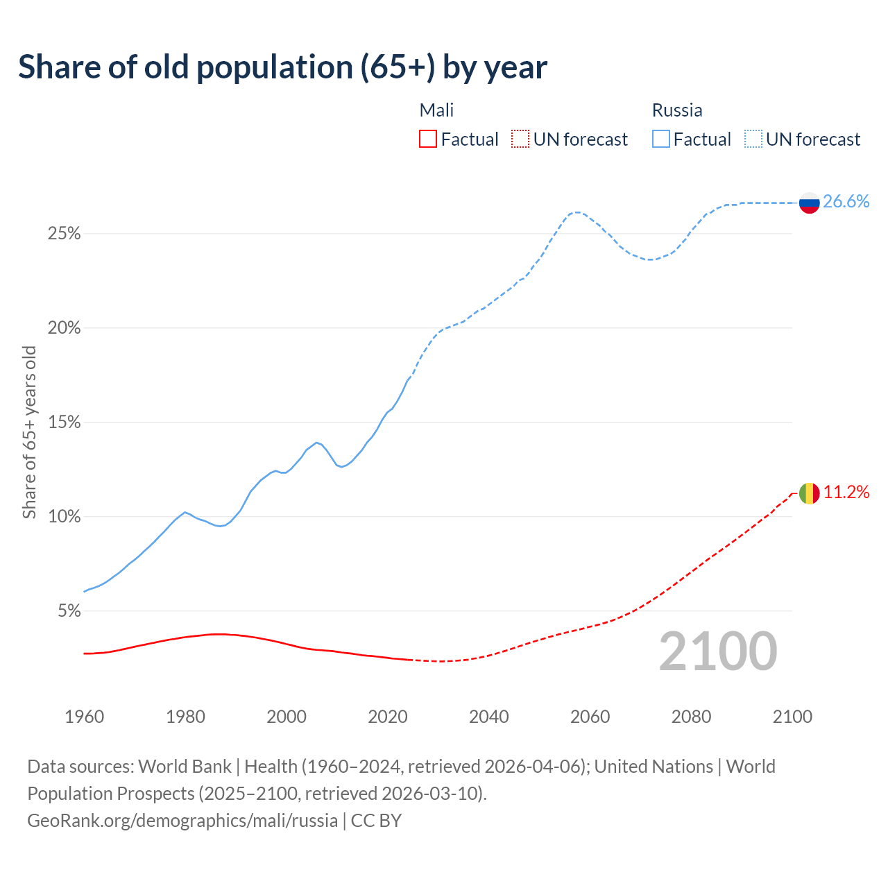The share of older people aged 65 and over is 2.38% in Mali and 17.2% in Russia. Life expectancy in Mali compared to Russia .