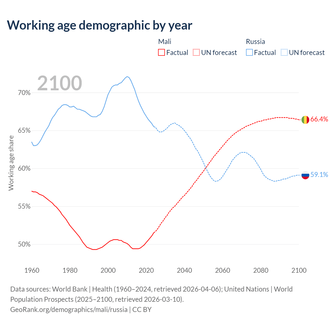 - Mali has 13.5M working age adults (aged 15-64) vs 93M in Russia.