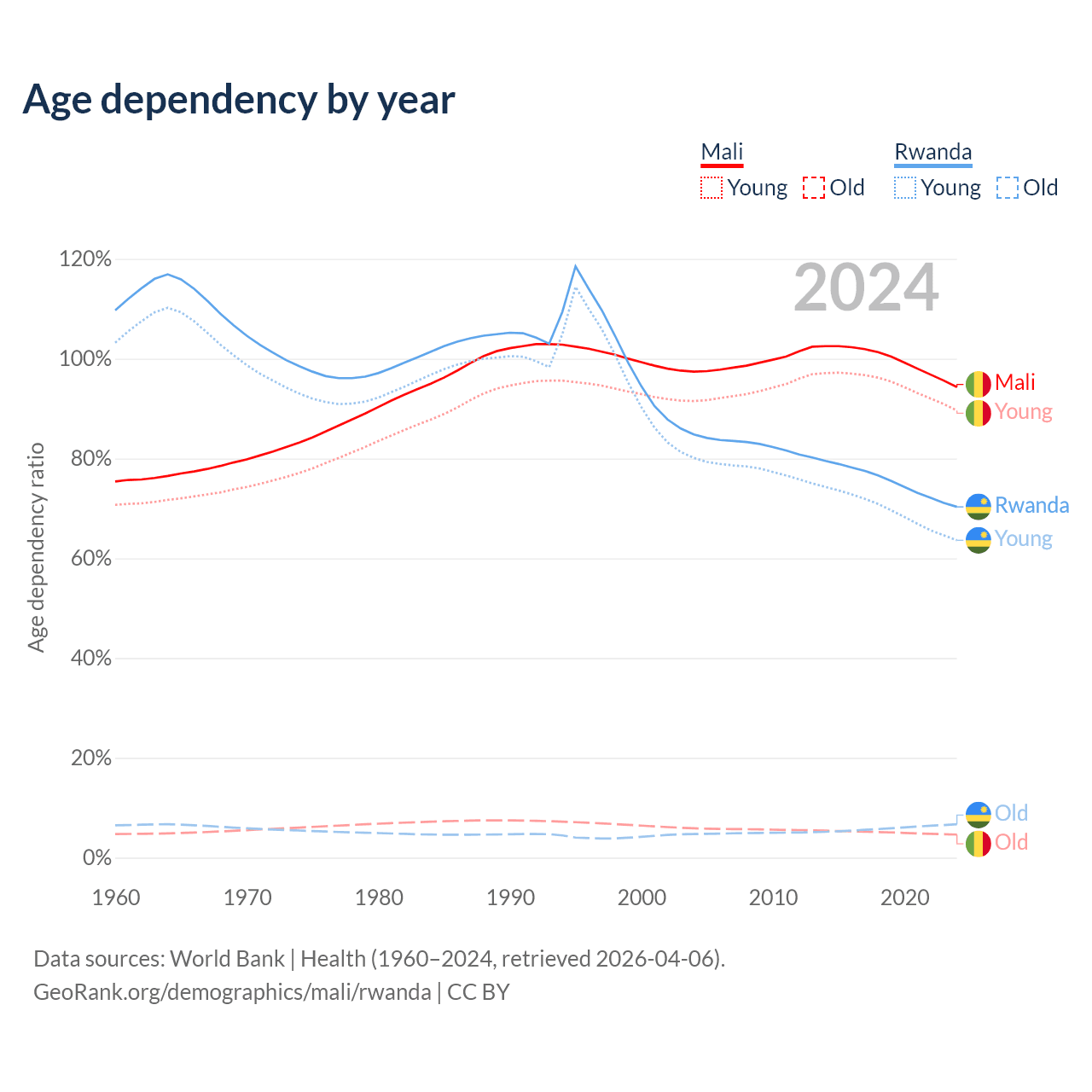 - Mali is ranked 193/196 by median age (oldest to youngest) vs 160/196 for Rwanda.