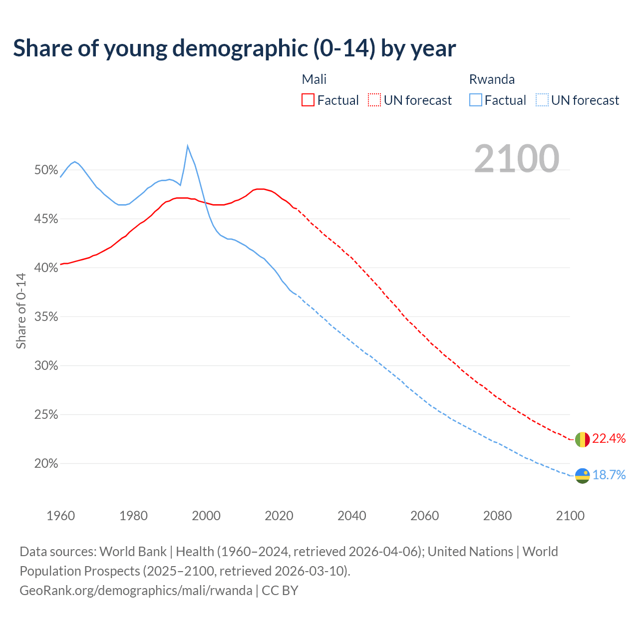- The share of young demographic (0-15 years old) in Mali is 46.1% vs 37.4% in Rwanda.