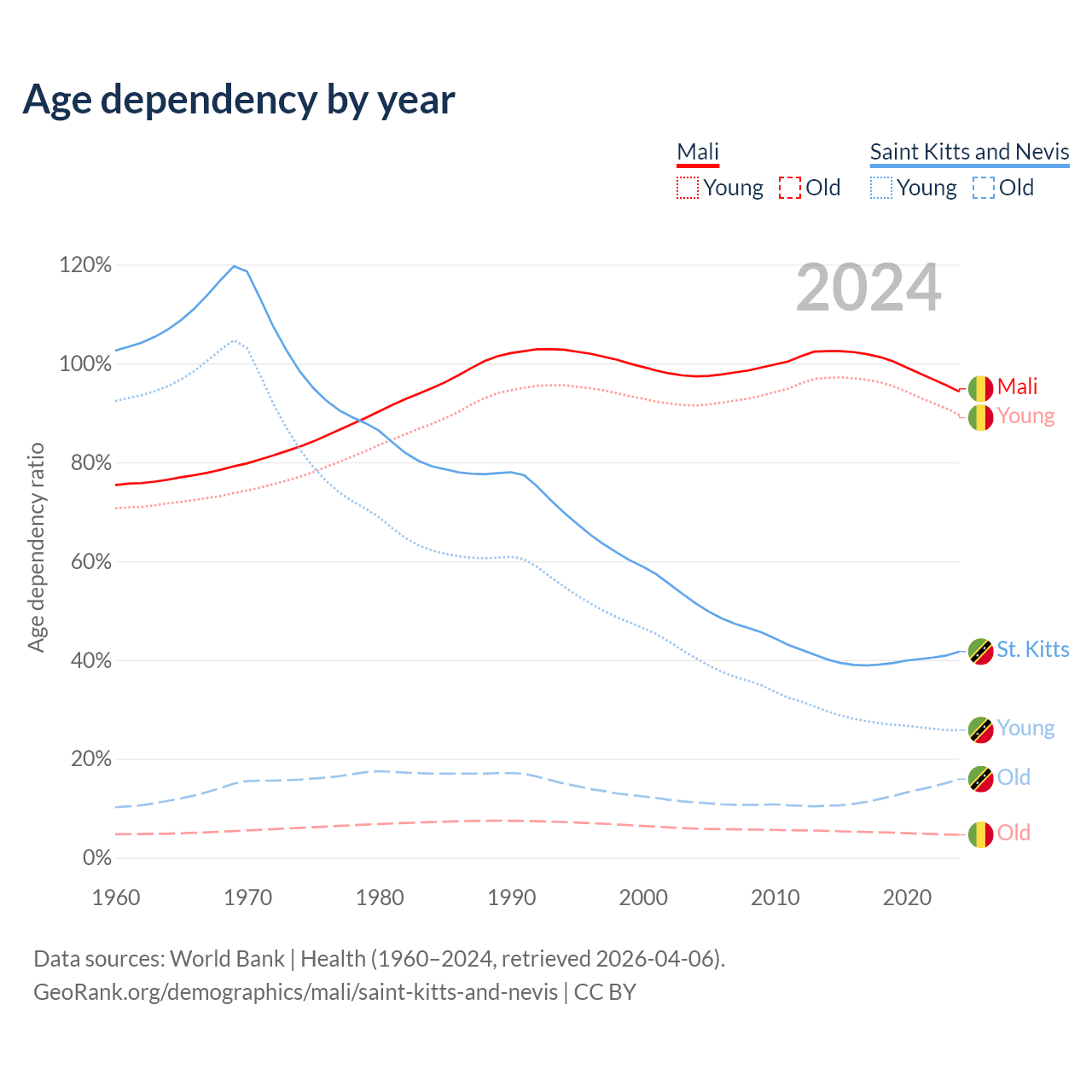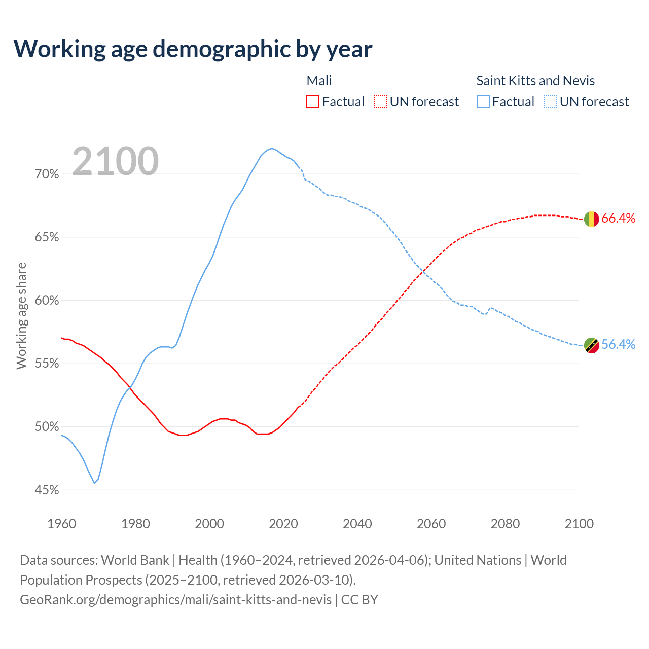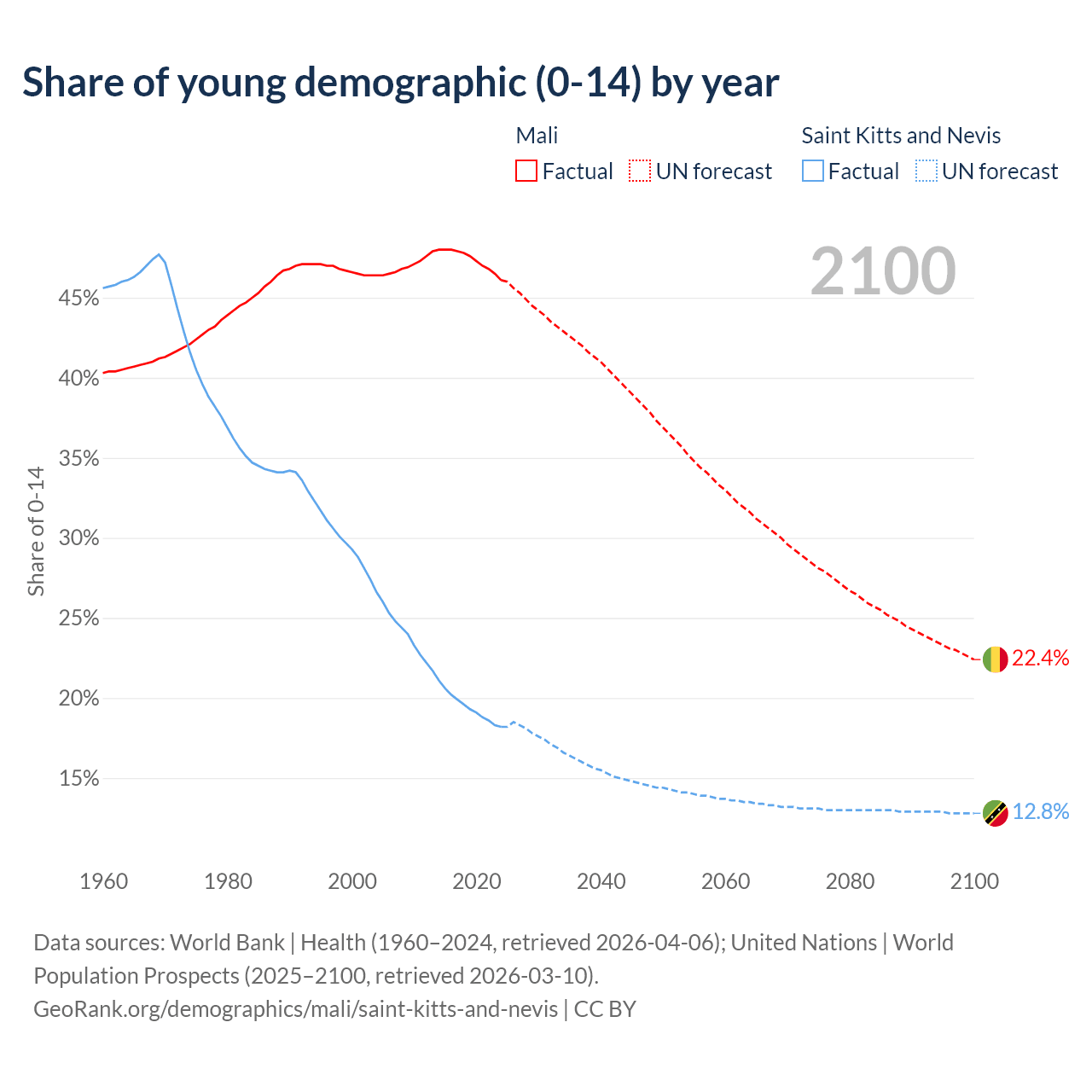 - The share of young demographic (0-15 years old) in Mali is 46.1% vs 18.2% in Saint Kitts and Nevis.