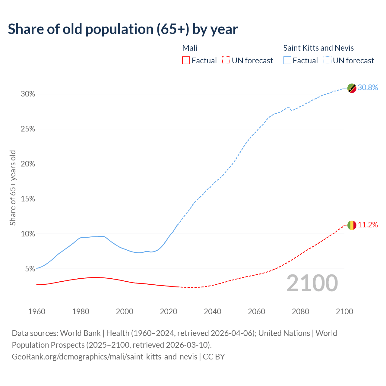 The share of older people aged 65 and over is 2.38% in Mali and 11.2% in Saint Kitts and Nevis. Life expectancy in Mali compared to Saint Kitts and Nevis .