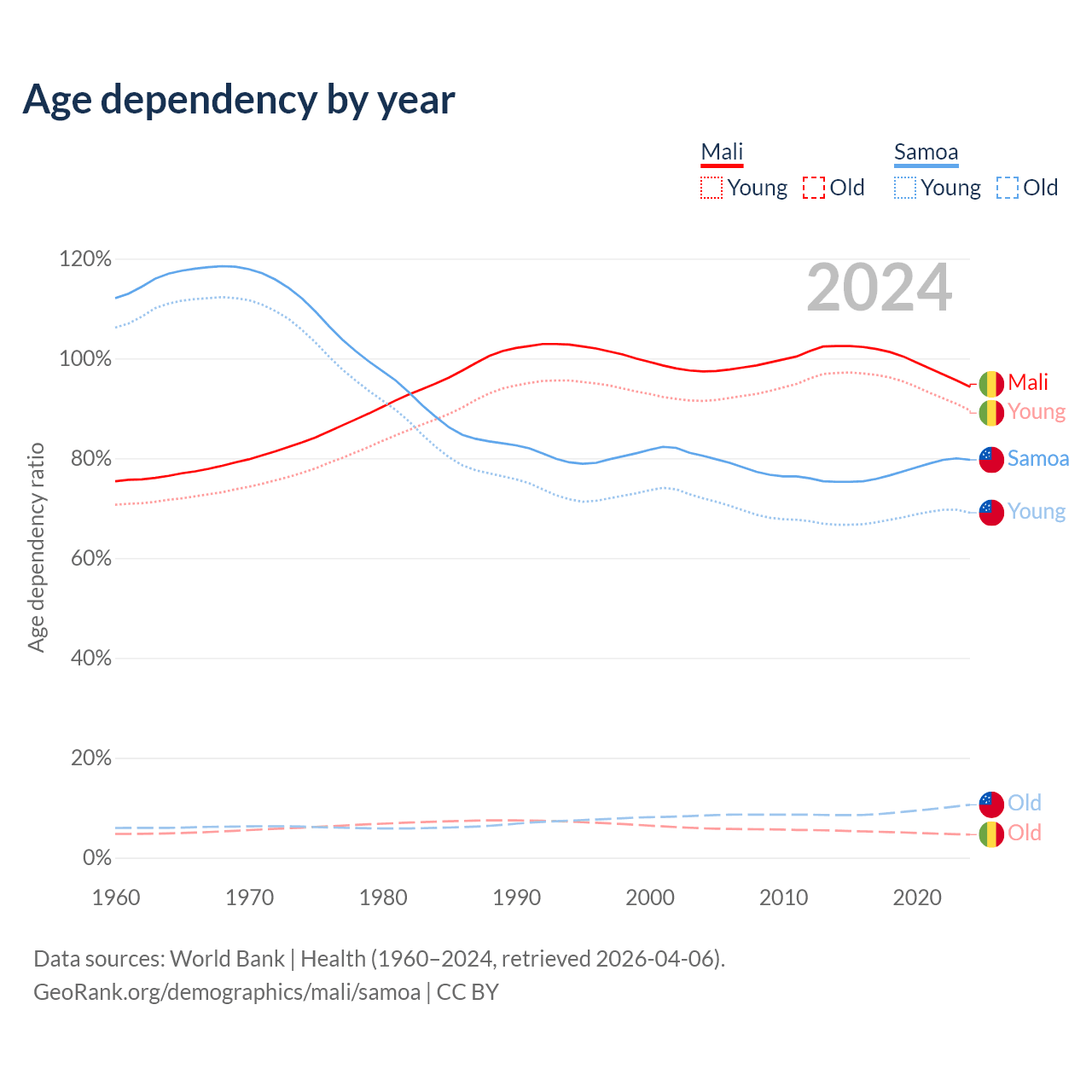 - Mali is ranked 193/196 by median age (oldest to youngest) vs 158/196 for Samoa.