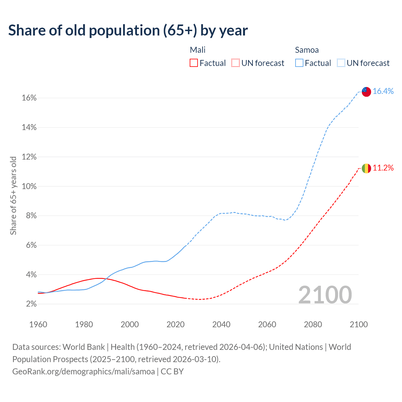 - The share of old-age demographic (65+) in Mali is 2.38% vs 5.88% in Samoa.