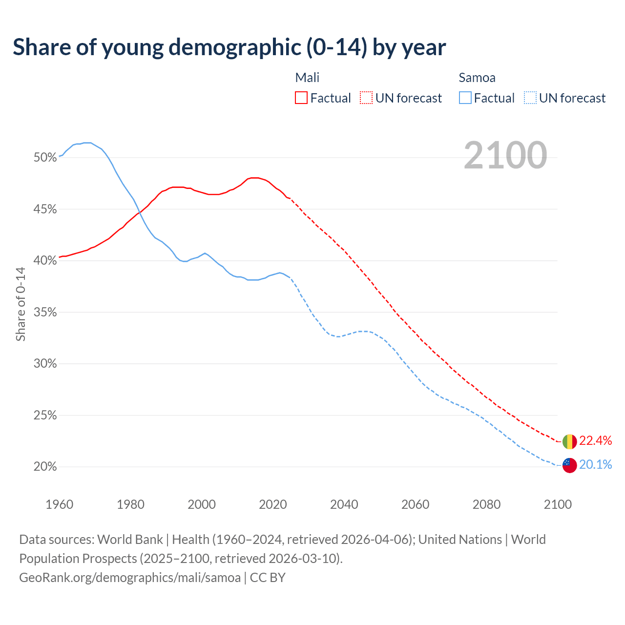 - The share of young demographic (0-15 years old) in Mali is 46.1% vs 38.5% in Samoa.