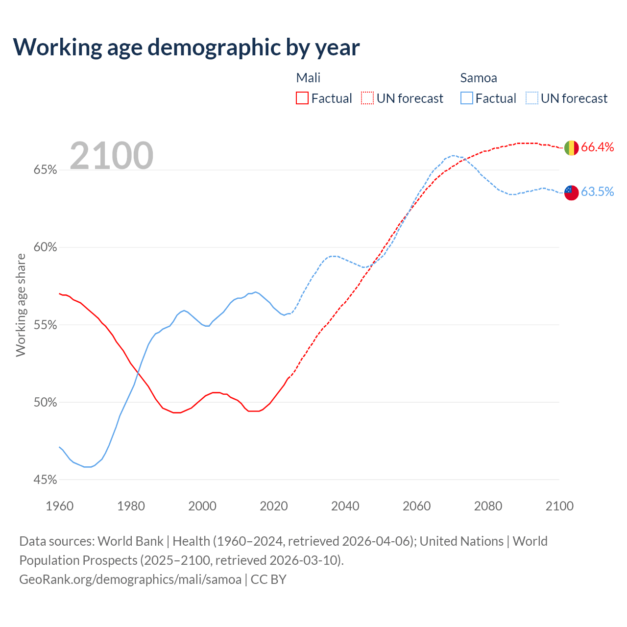 - Mali has 13.5M working age adults (aged 15-64) vs 123K in Samoa.