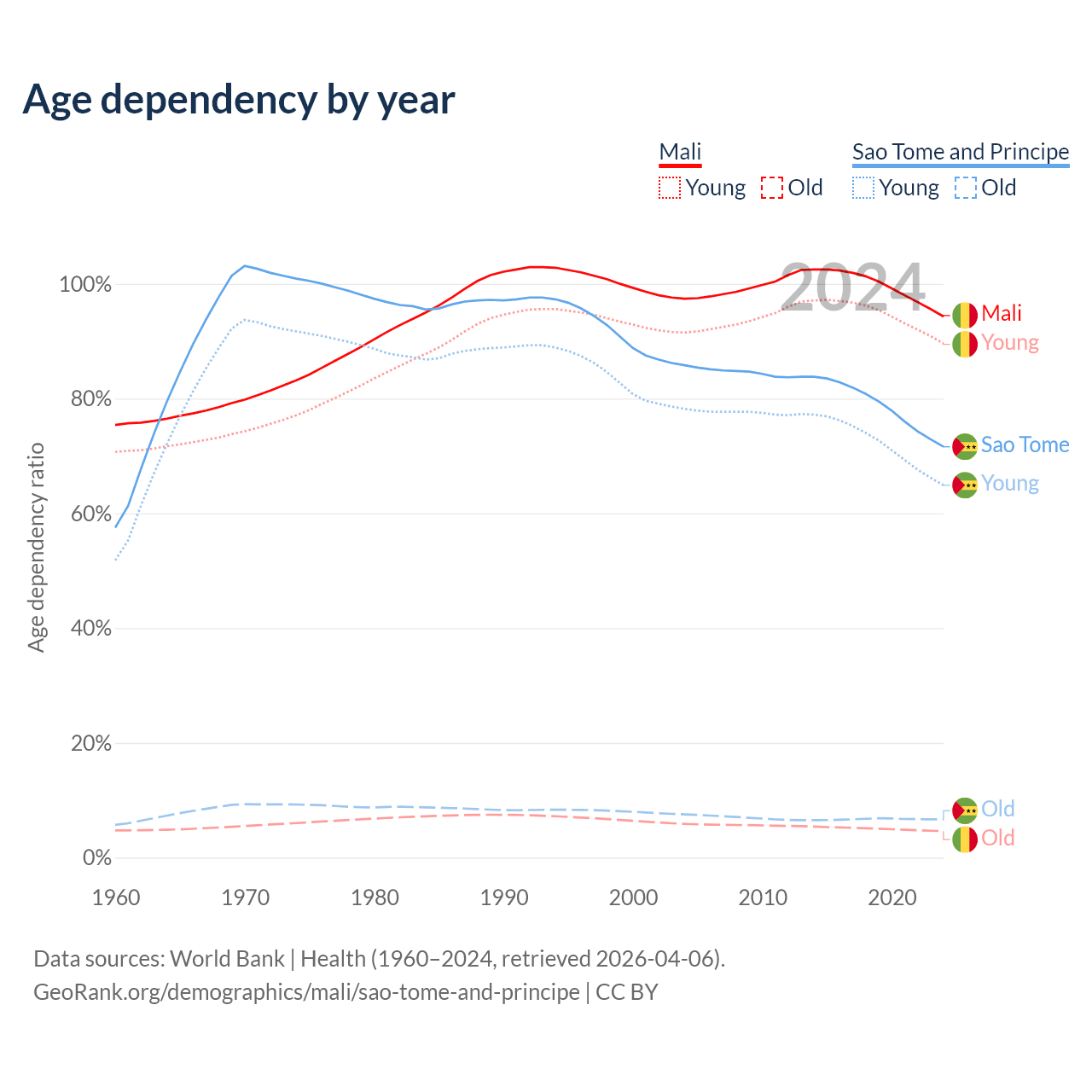 - Mali is ranked 193/196 by median age (oldest to youngest) vs 163/196 for Sao Tome and Principe.