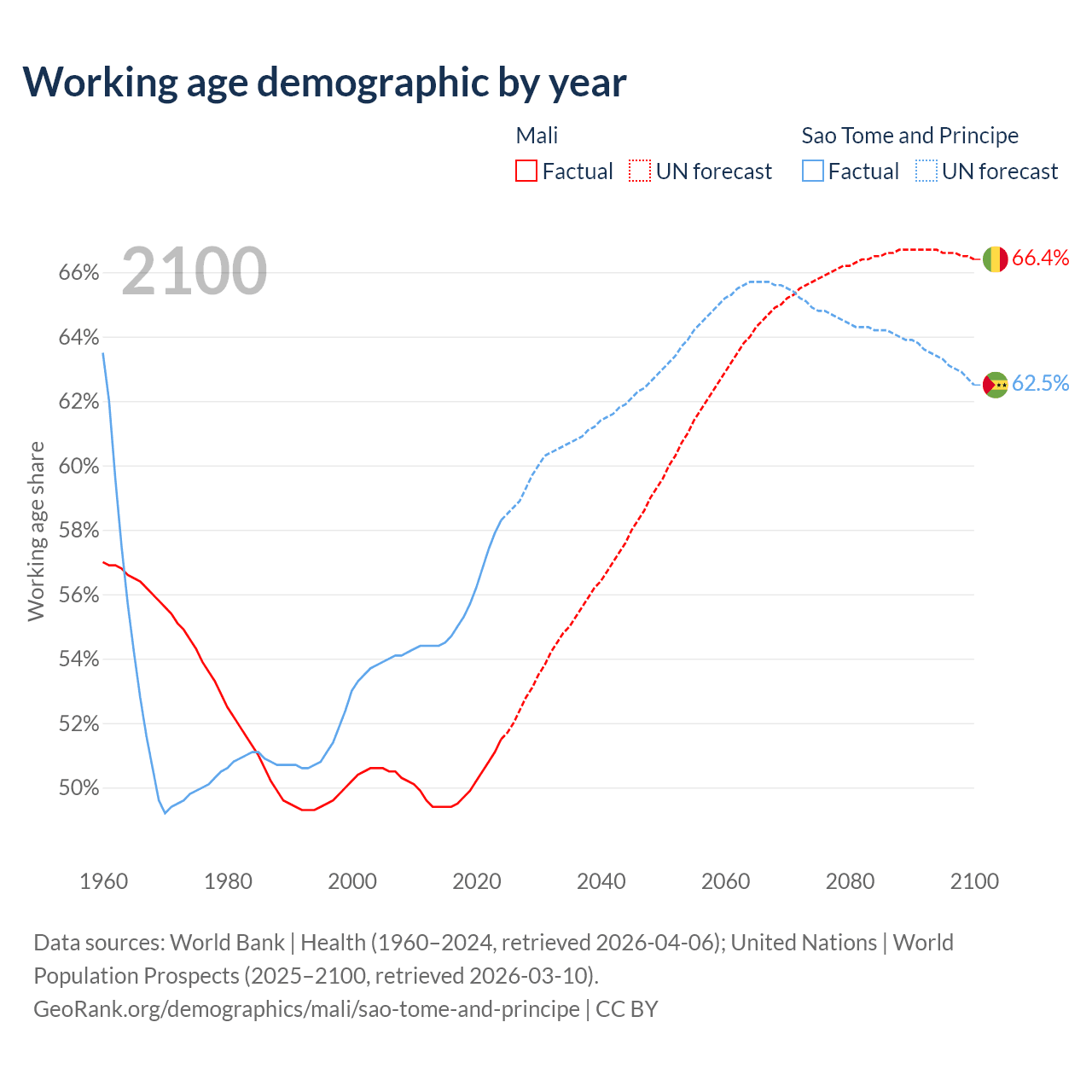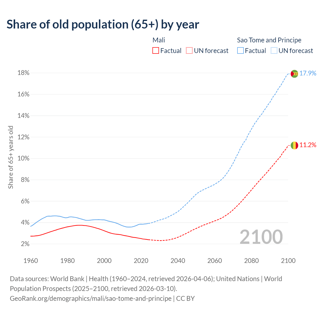 Median age Mali vs Sao Tome and Principe, 1960-2100