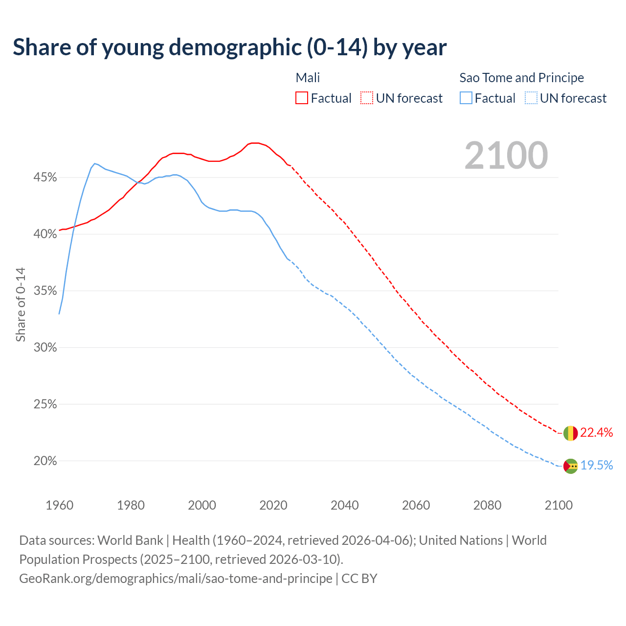 - The share of young demographic (0-15 years old) in Mali is 46.1% vs 37.8% in Sao Tome and Principe.