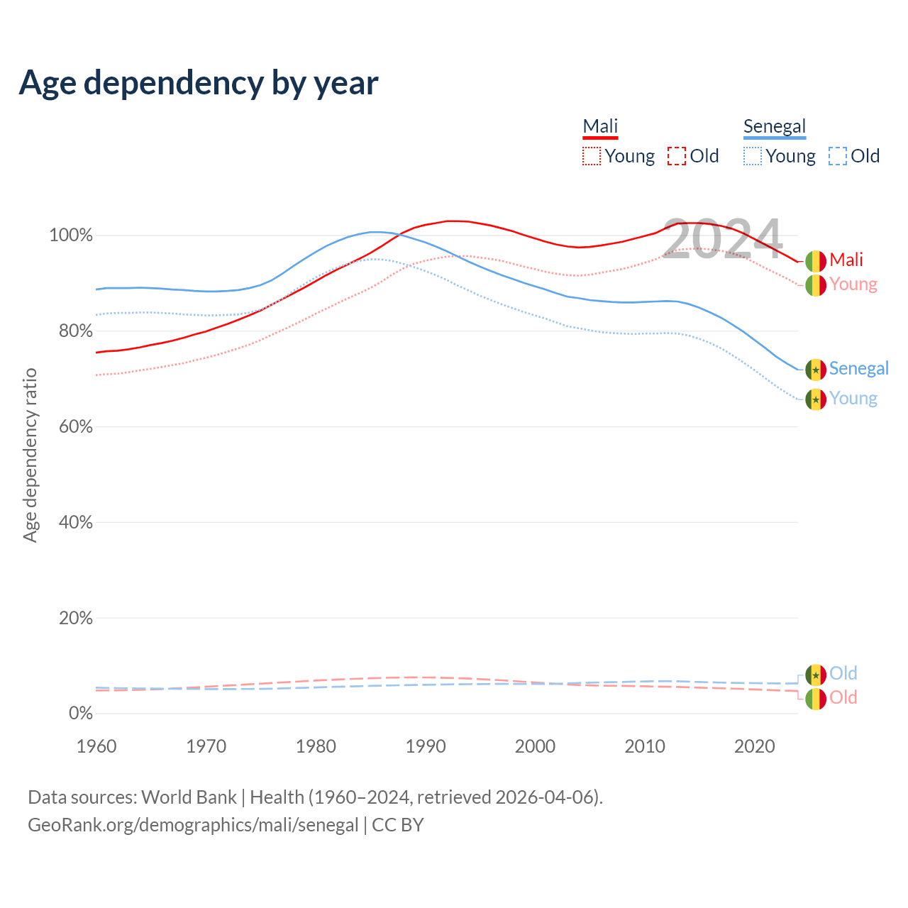 - Mali is ranked 193/196 by median age (oldest to youngest) vs 162/196 for Senegal.