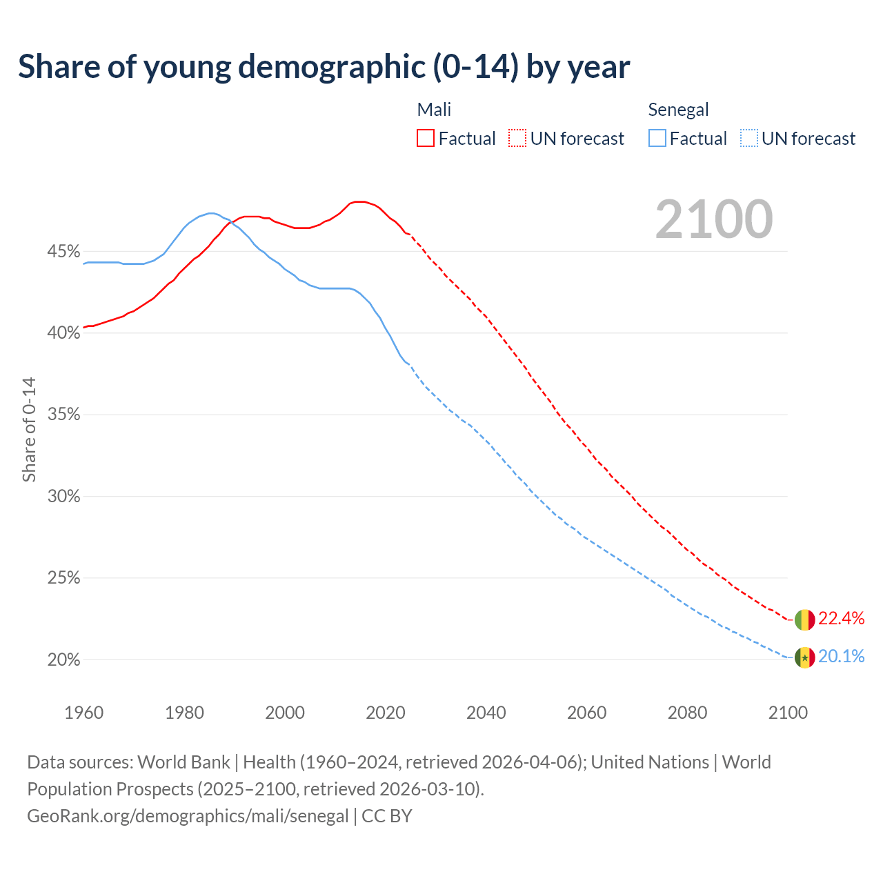 - The share of young demographic (0-15 years old) in Mali is 46.1% vs 38.2% in Senegal.