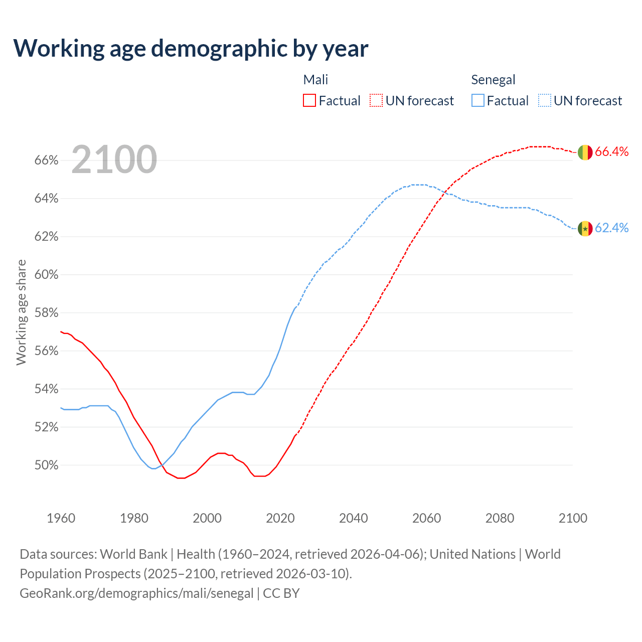 - Mali has 13.5M working age adults (aged 15-64) vs 11.3M in Senegal.