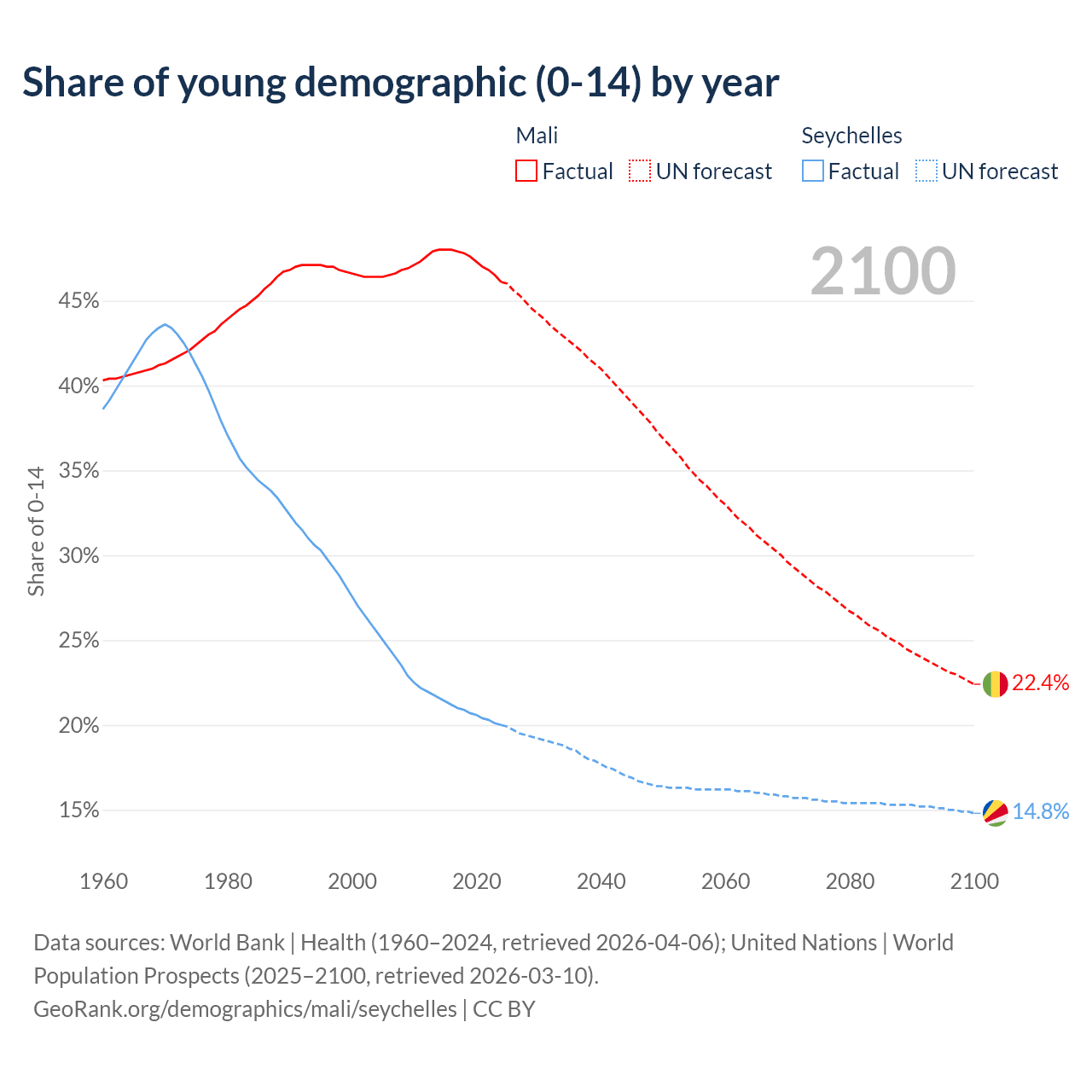 - The share of young demographic (0-15 years old) in Mali is 46.1% vs 20% in the Seychelles.