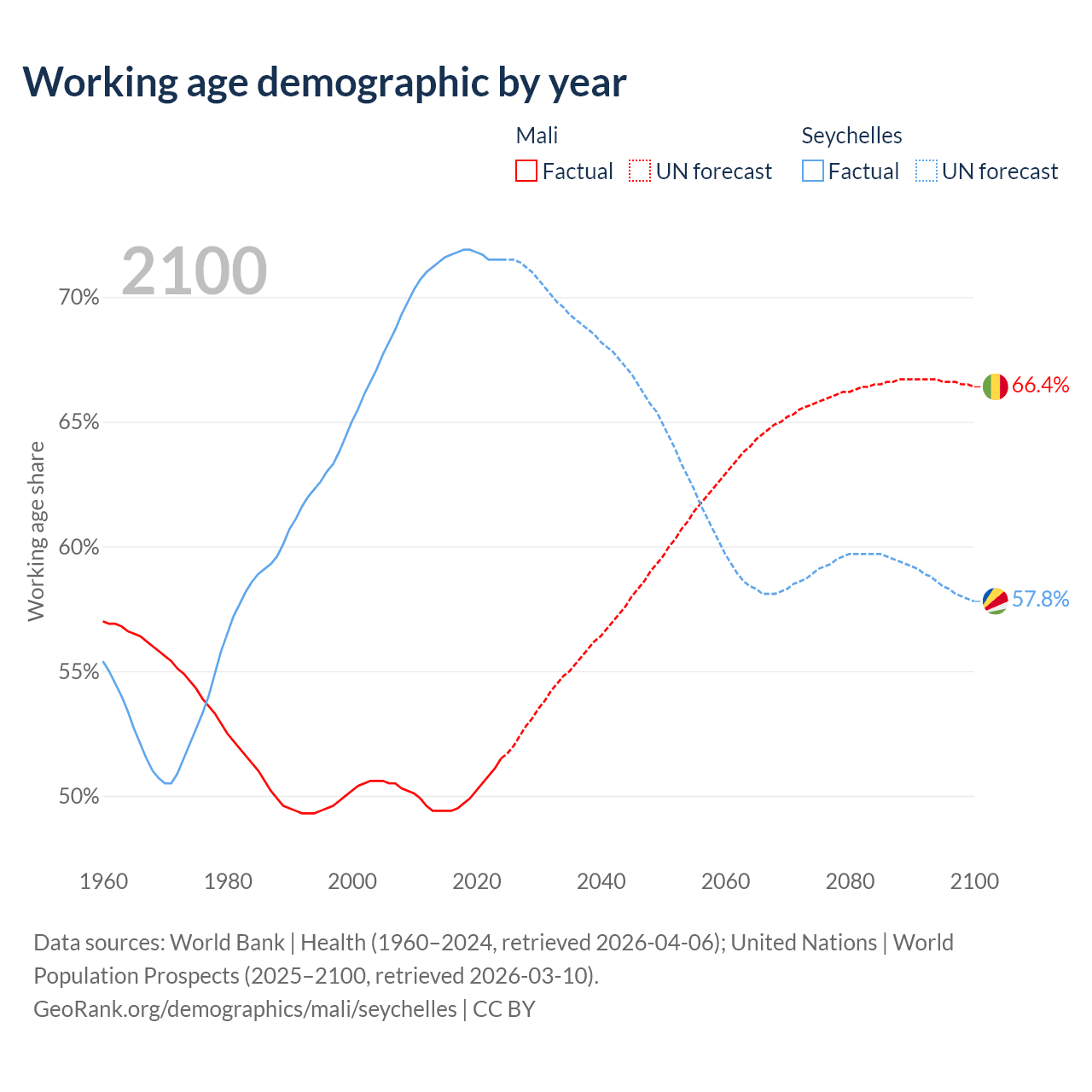 - Mali has 13.5M working age adults (aged 15-64) vs 90.3K in the Seychelles.