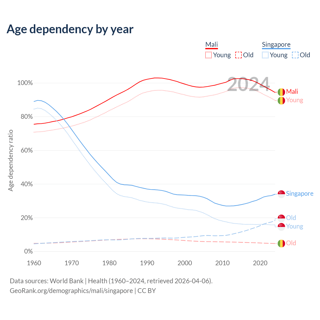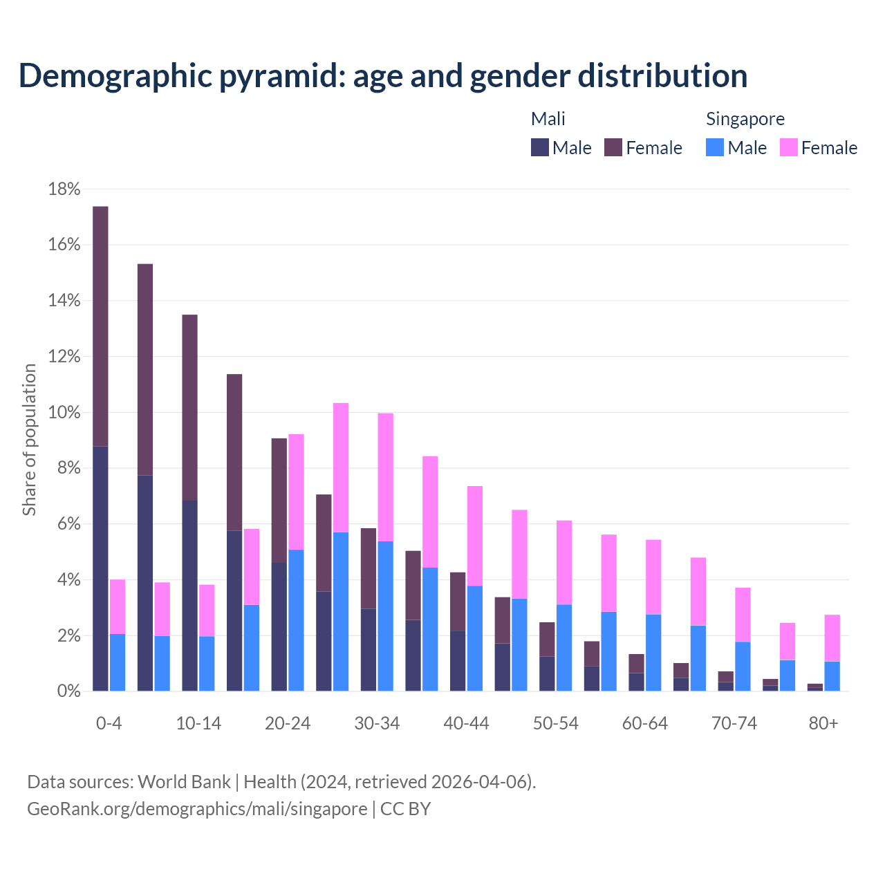- Mali is ranked 193/196 by median age (oldest to youngest) vs 68/196 for Singapore.