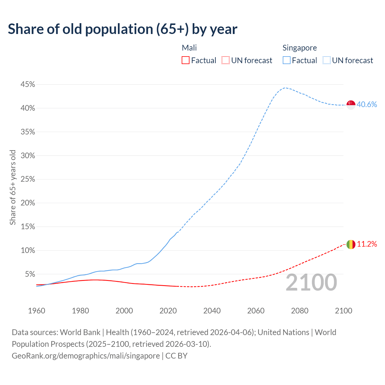 - The share of old-age demographic (65+) in Mali is 2.38% vs 13.7% in Singapore.