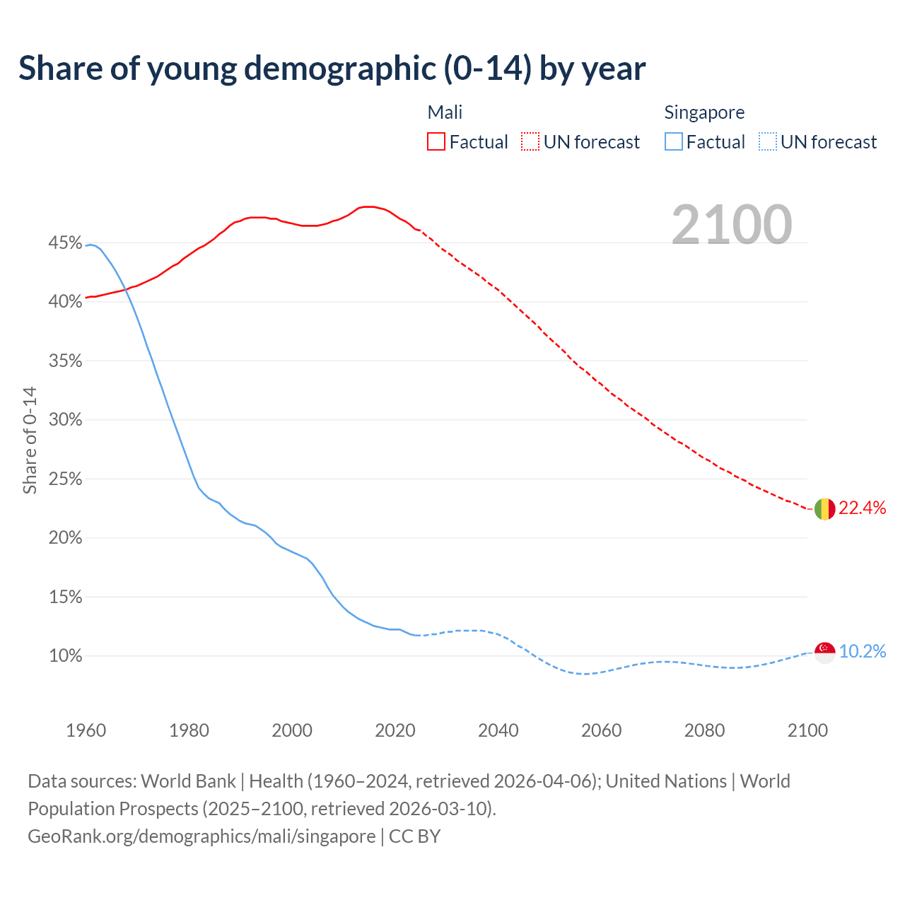 - The share of young demographic (0-15 years old) in Mali is 46.1% vs 11.7% in Singapore.