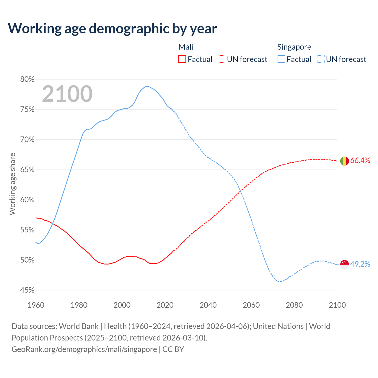 - Mali has 13.5M working age adults (aged 15-64) vs 4.57M in Singapore.
