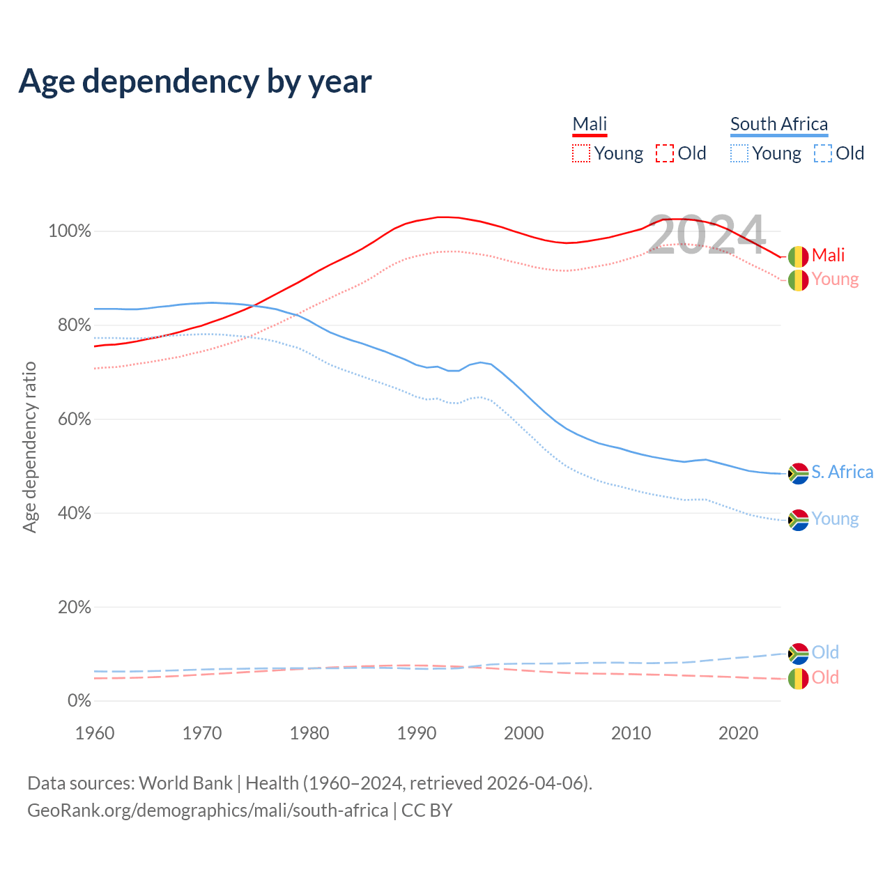 - Mali is ranked 193/196 by median age (oldest to youngest) vs 107/196 for South Africa.