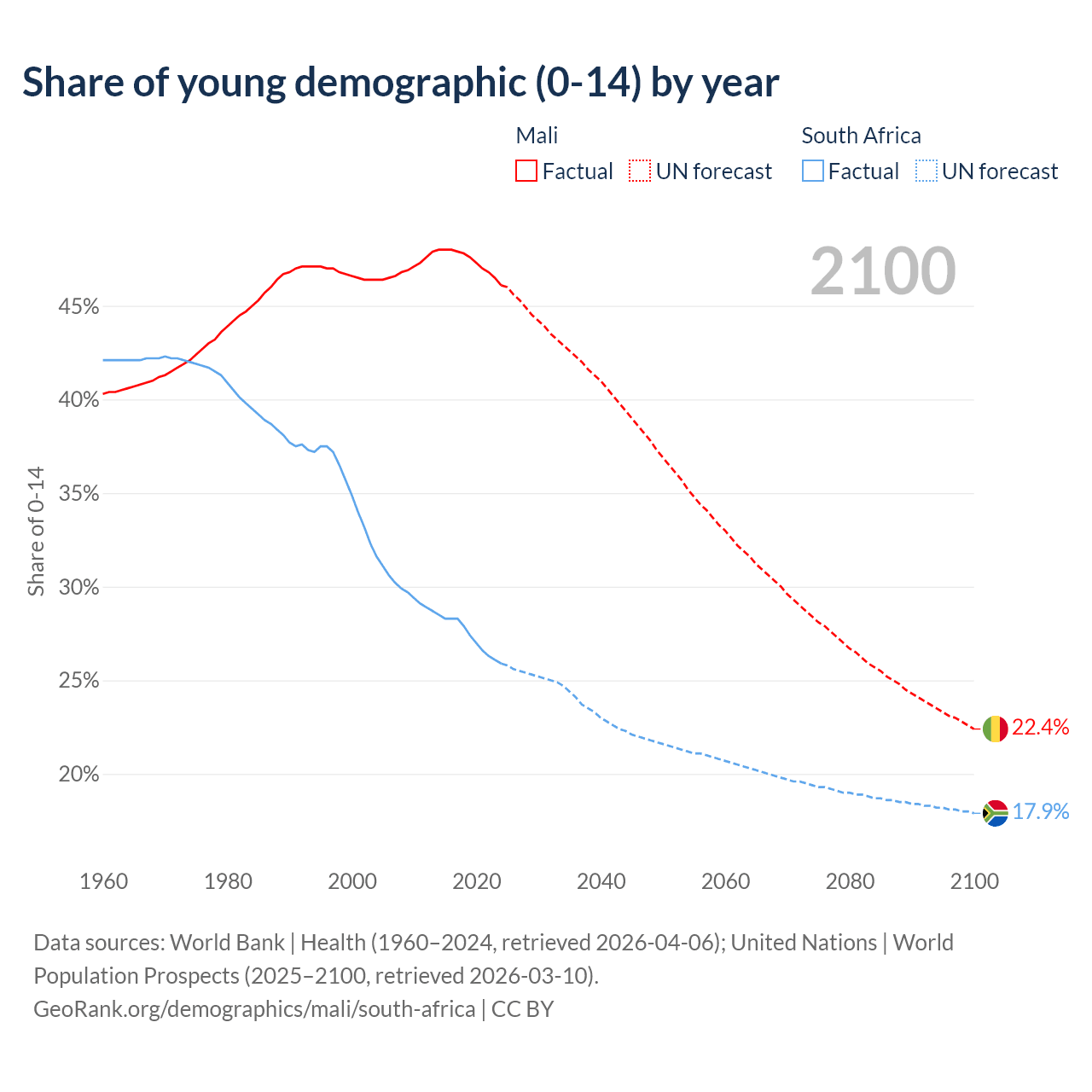 Median age Mali vs South Africa, 1960-2100