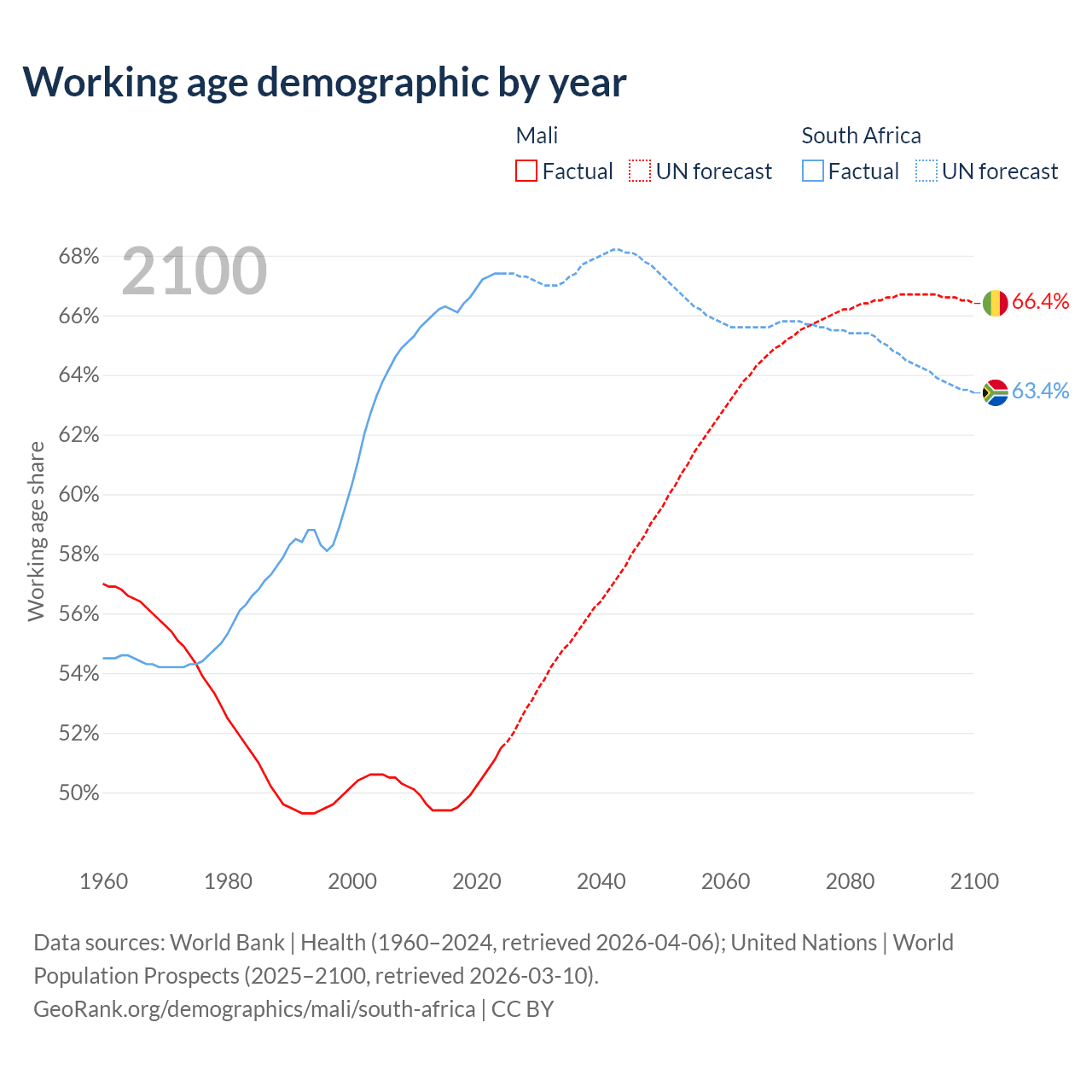 The share of older people aged 65 and over is 2.38% in Mali and 6.69% in South Africa. Life expectancy in Mali compared to South Africa .