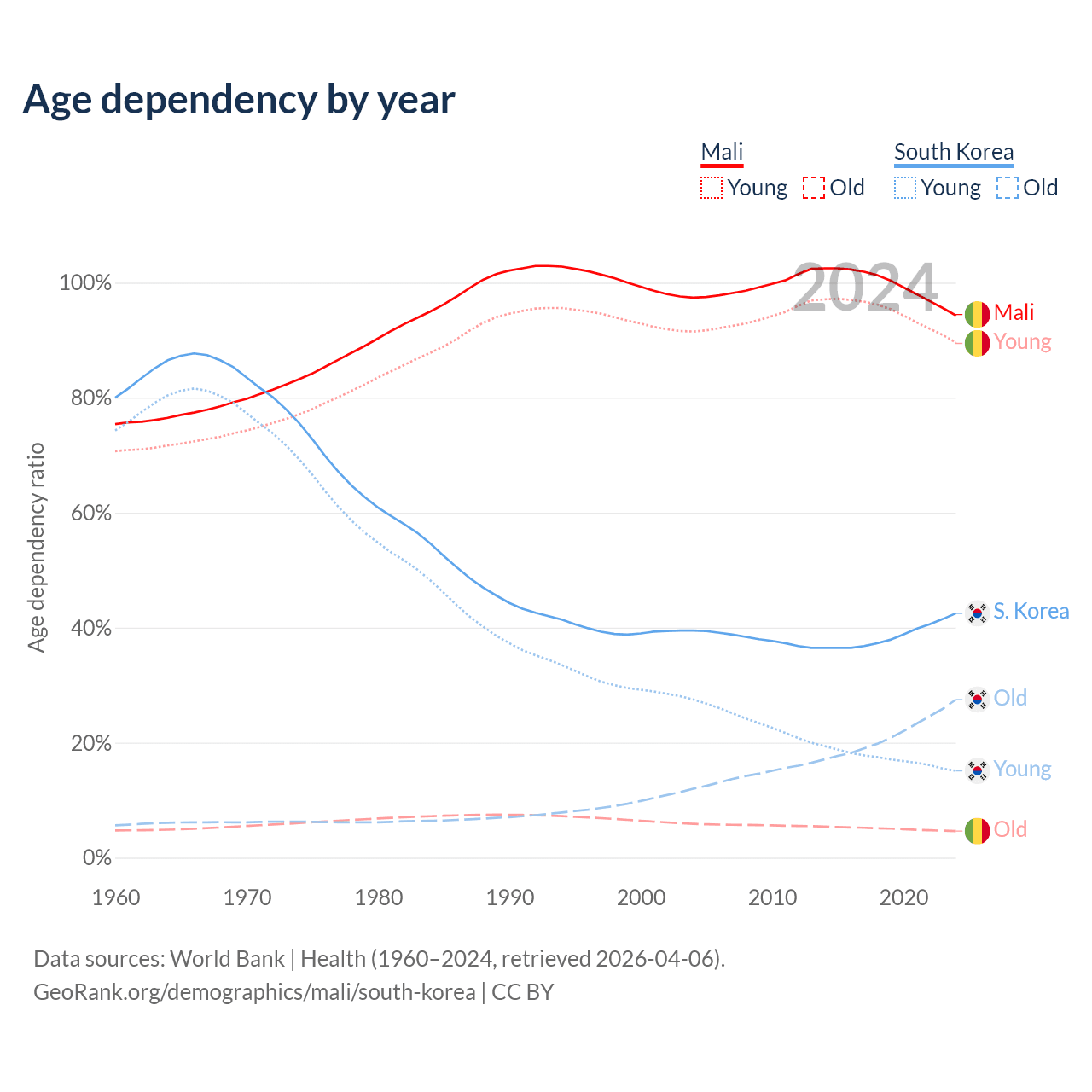 - Mali is ranked 193/196 by median age (oldest to youngest) vs 10/196 for South Korea.