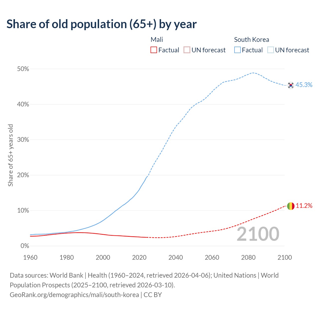 The share of older people aged 65 and over is 2.38% in Mali and 19.3% in South Korea. Life expectancy in Mali compared to South Korea .