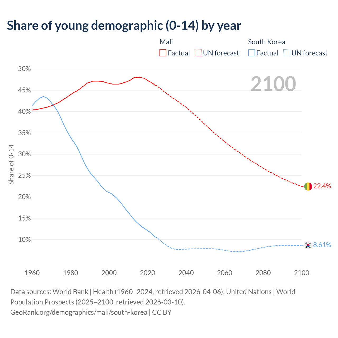 - The share of young demographic (0-15 years old) in Mali is 46.1% vs 10.6% in South Korea.