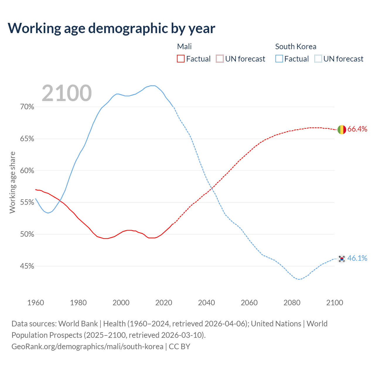 - Mali has 13.5M working age adults (aged 15-64) vs 36.2M in South Korea.