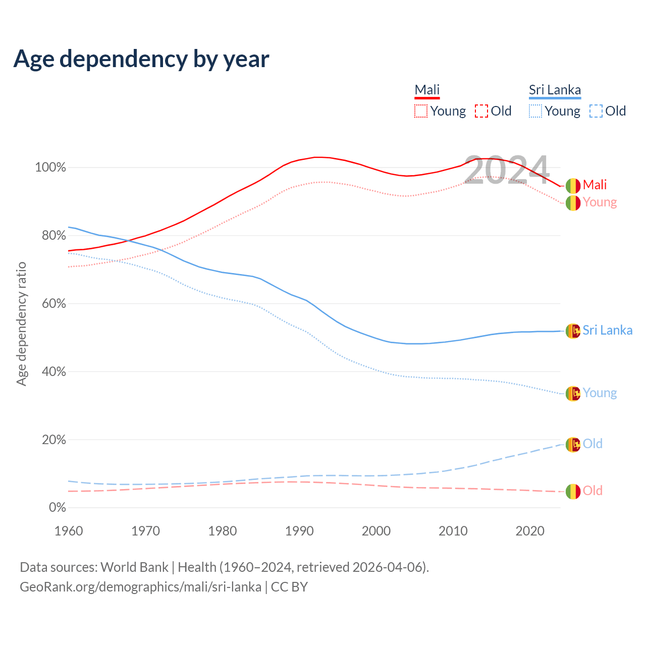 - Mali is ranked 193/196 by median age (oldest to youngest) vs 81/196 for Sri Lanka.