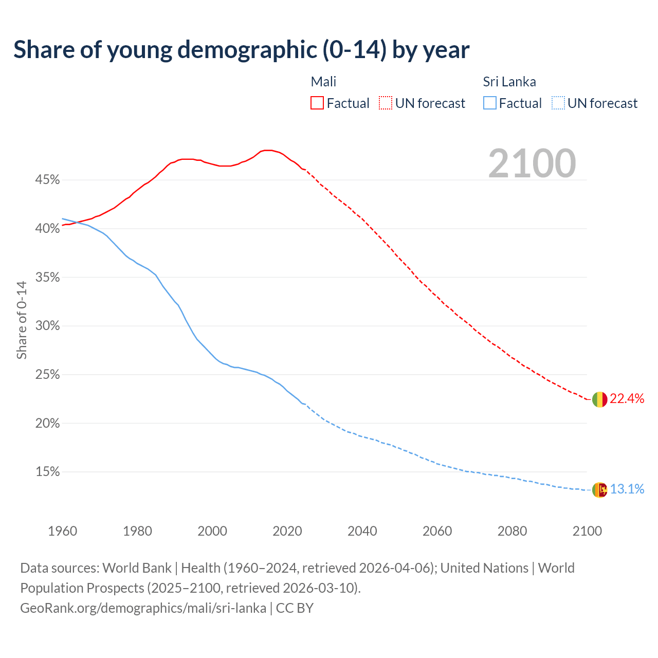 - The share of young demographic (0-15 years old) in Mali is 46.1% vs 22% in Sri Lanka.