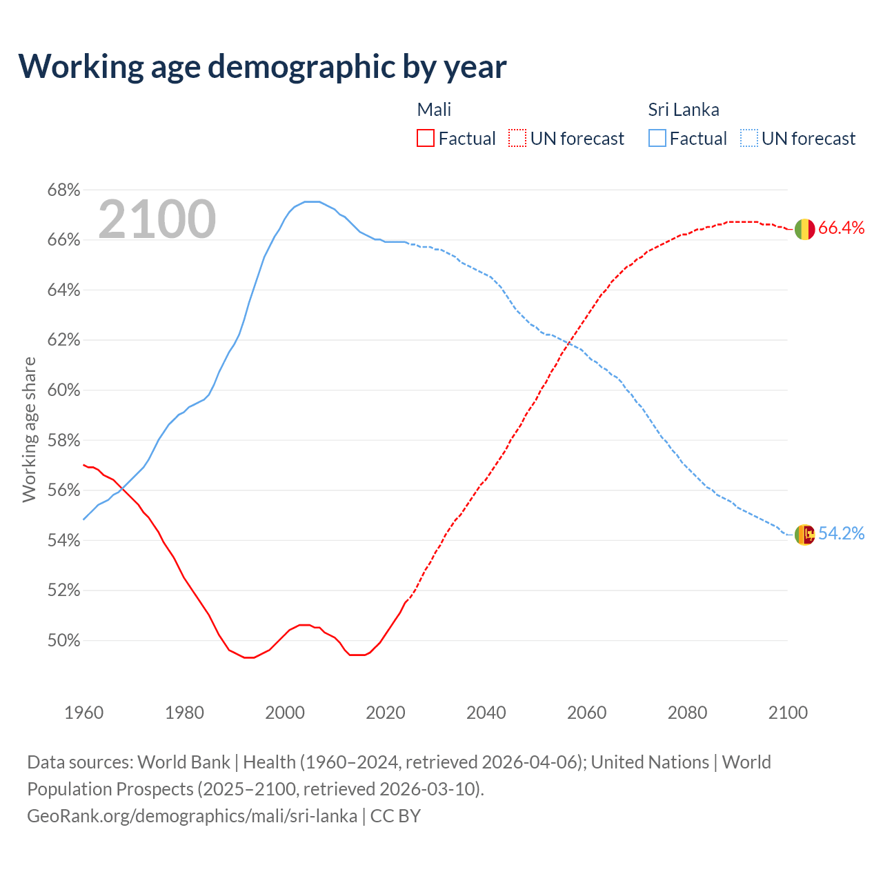The share of older people aged 65 and over is 2.38% in Mali and 12.1% in Sri Lanka. Life expectancy in Mali compared to Sri Lanka .