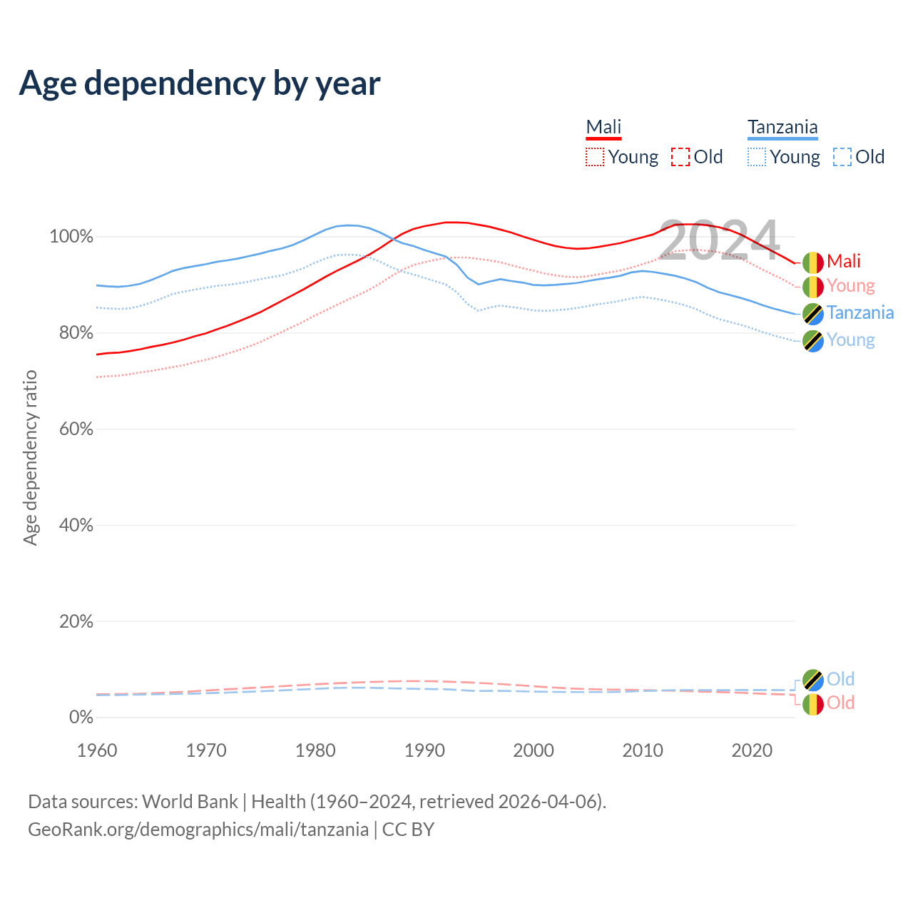 - Mali is ranked 193/196 by median age (oldest to youngest) vs 184/196 for Tanzania.