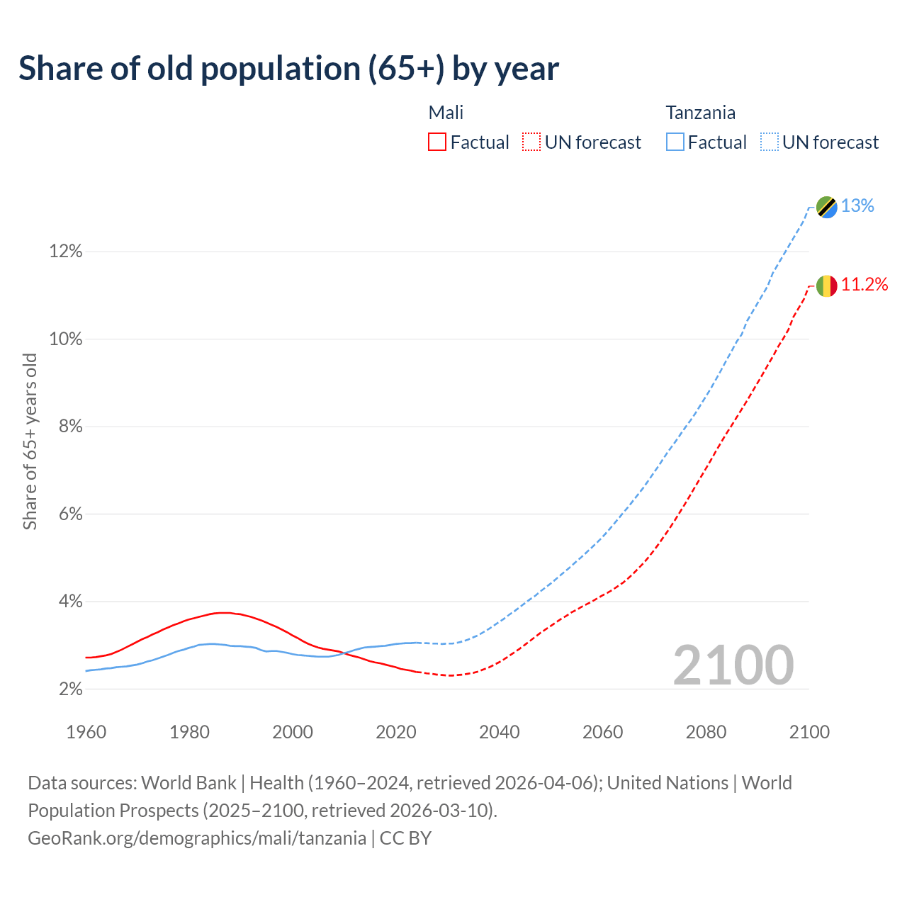 The share of older people aged 65 and over is 2.38% in Mali and 3.05% in Tanzania. Life expectancy in Mali compared to Tanzania .