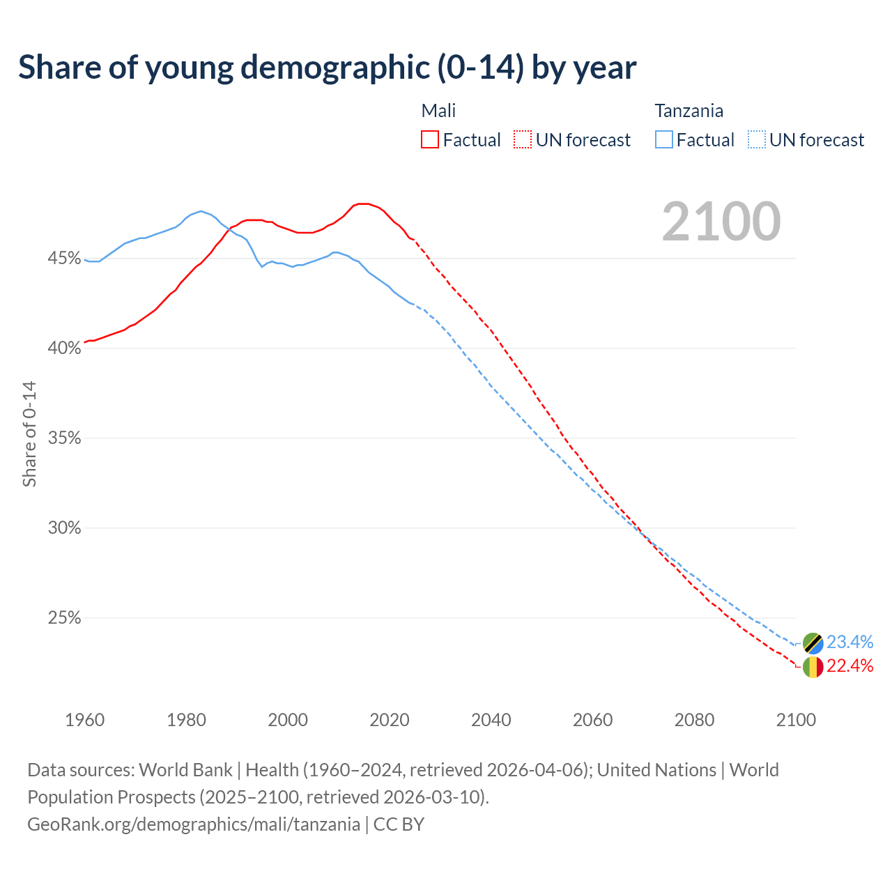 - The share of young demographic (0-15 years old) in Mali is 46.1% vs 42.5% in Tanzania.