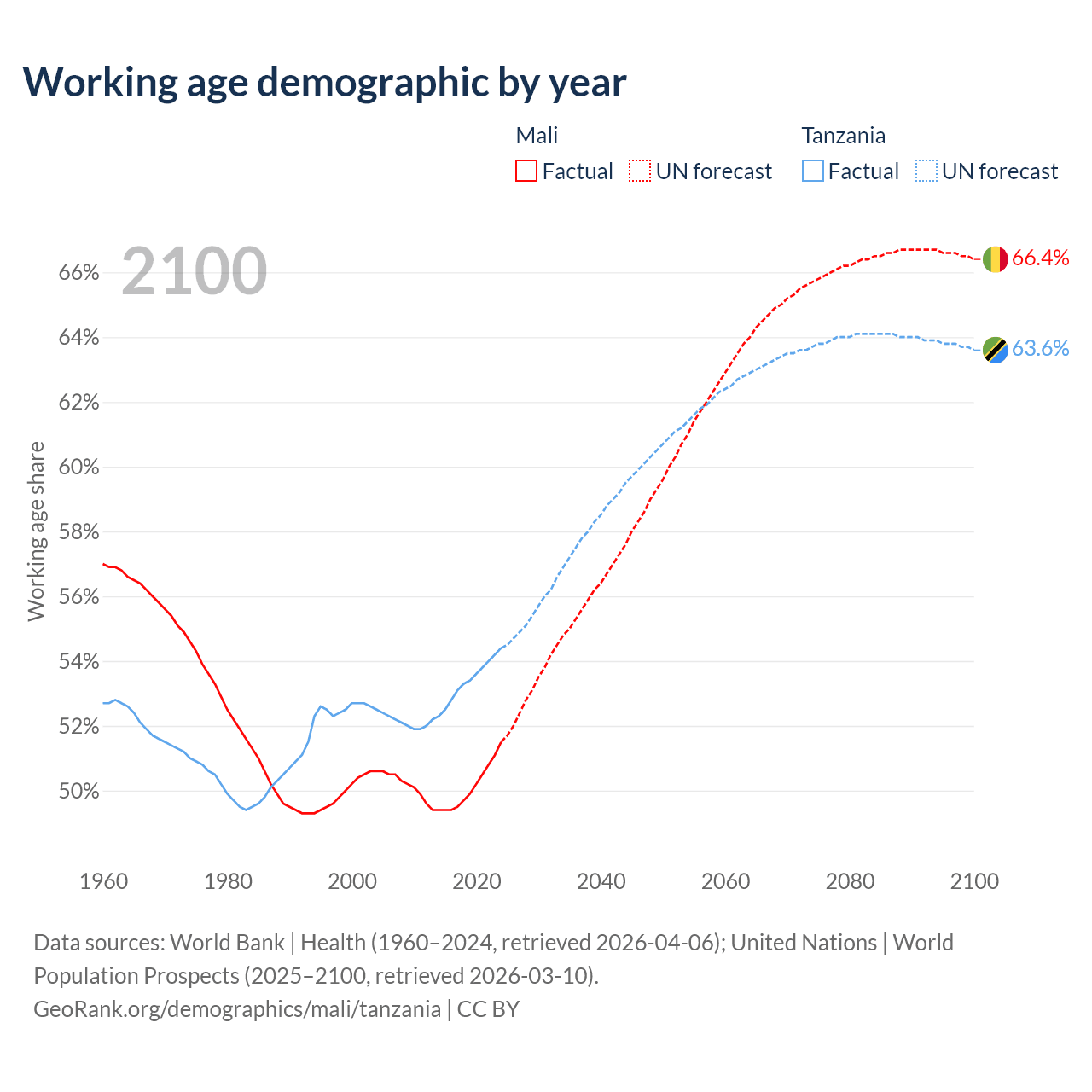 - Mali has 13.5M working age adults (aged 15-64) vs 39.8M in Tanzania.