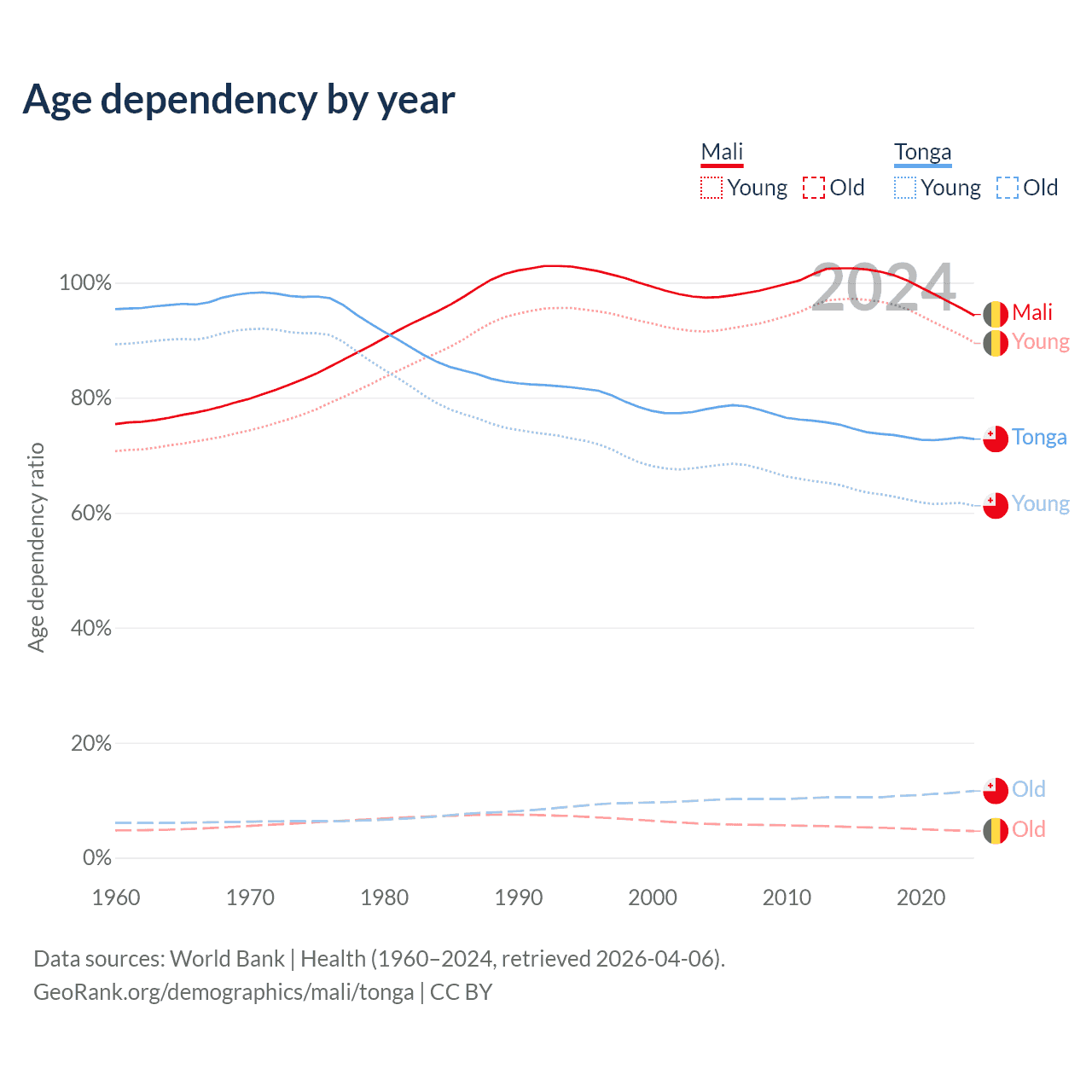 - Mali is ranked 193/196 by median age (oldest to youngest) vs 149/196 for Tonga.