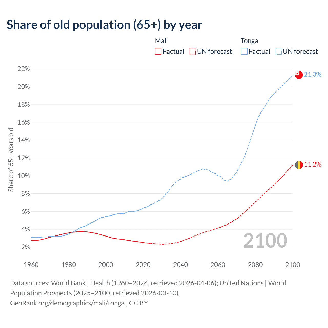 - The share of old-age demographic (65+) in Mali is 2.38% vs 6.72% in Tonga.