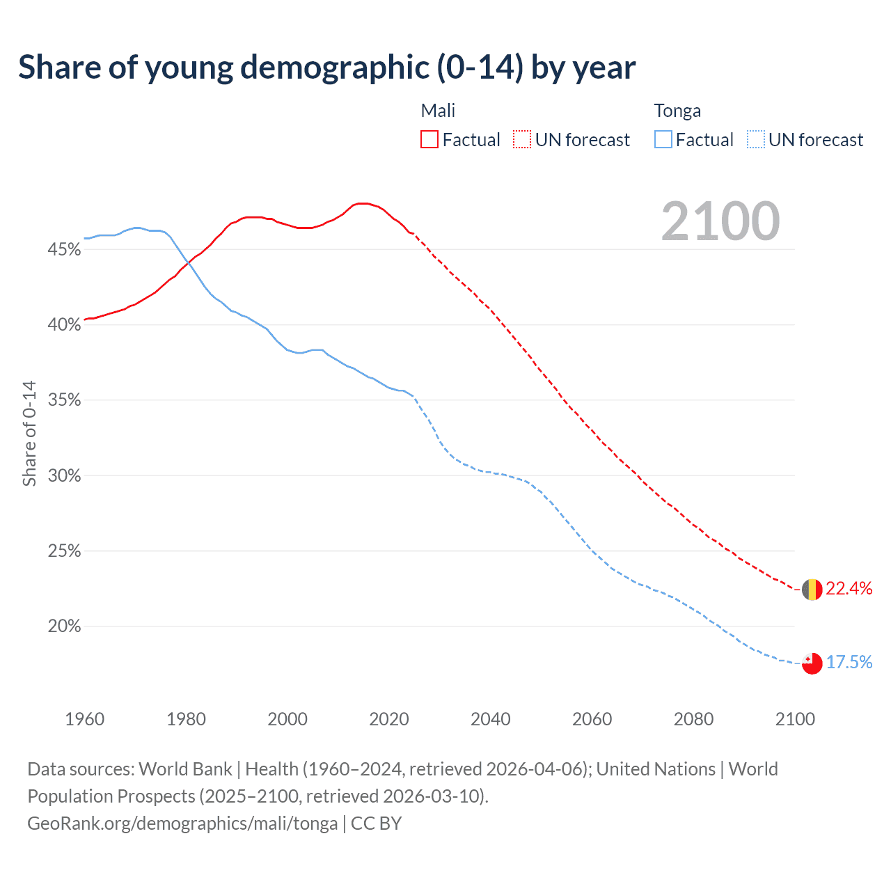 - The share of young demographic (0-15 years old) in Mali is 46.1% vs 35.4% in Tonga.
