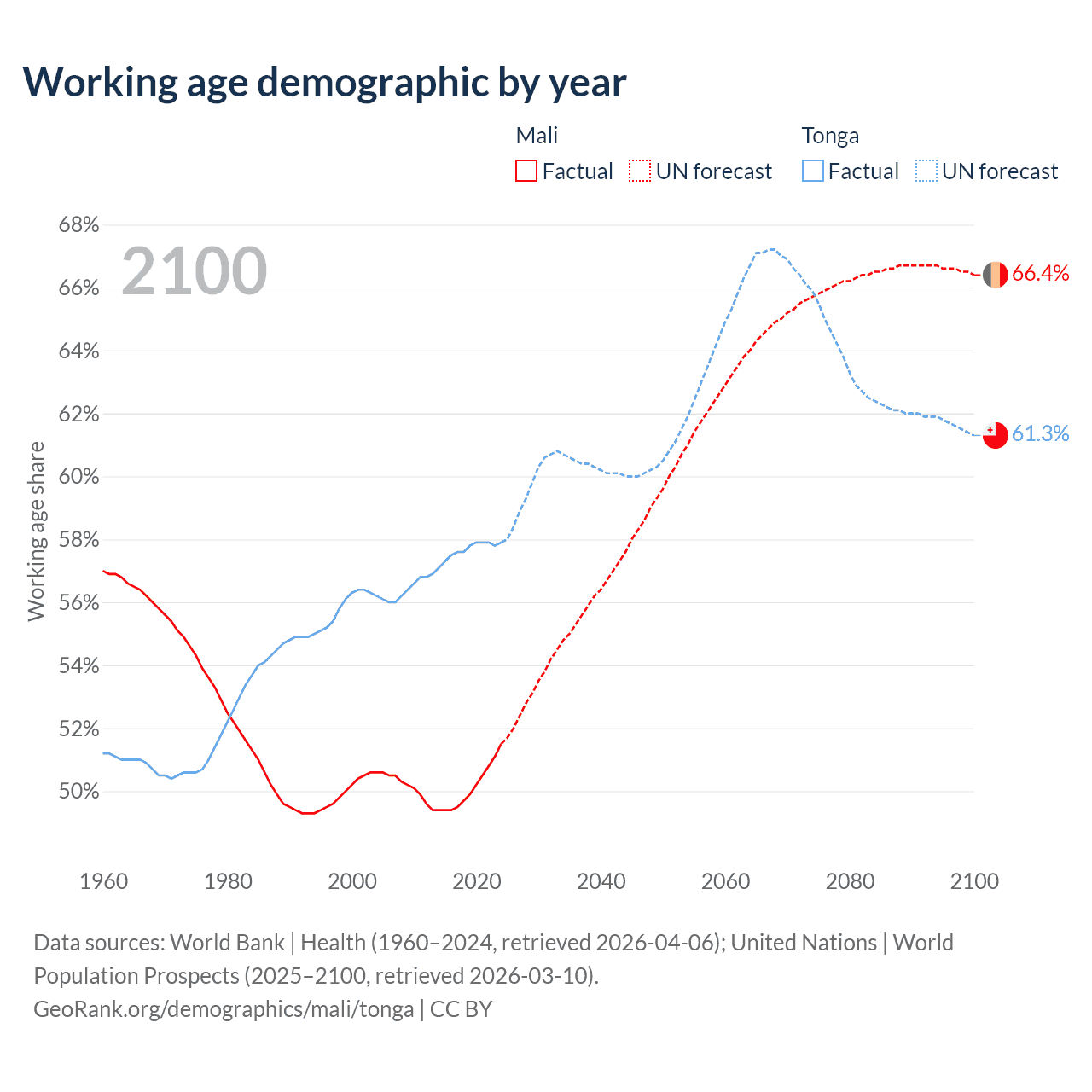 - Mali has 13.5M working age adults (aged 15-64) vs 59.8K in Tonga.