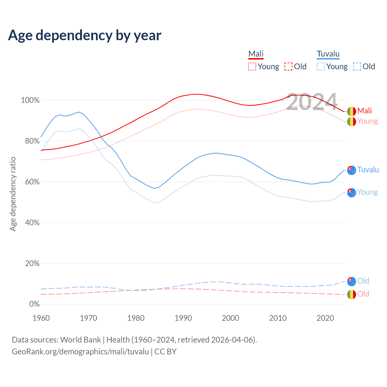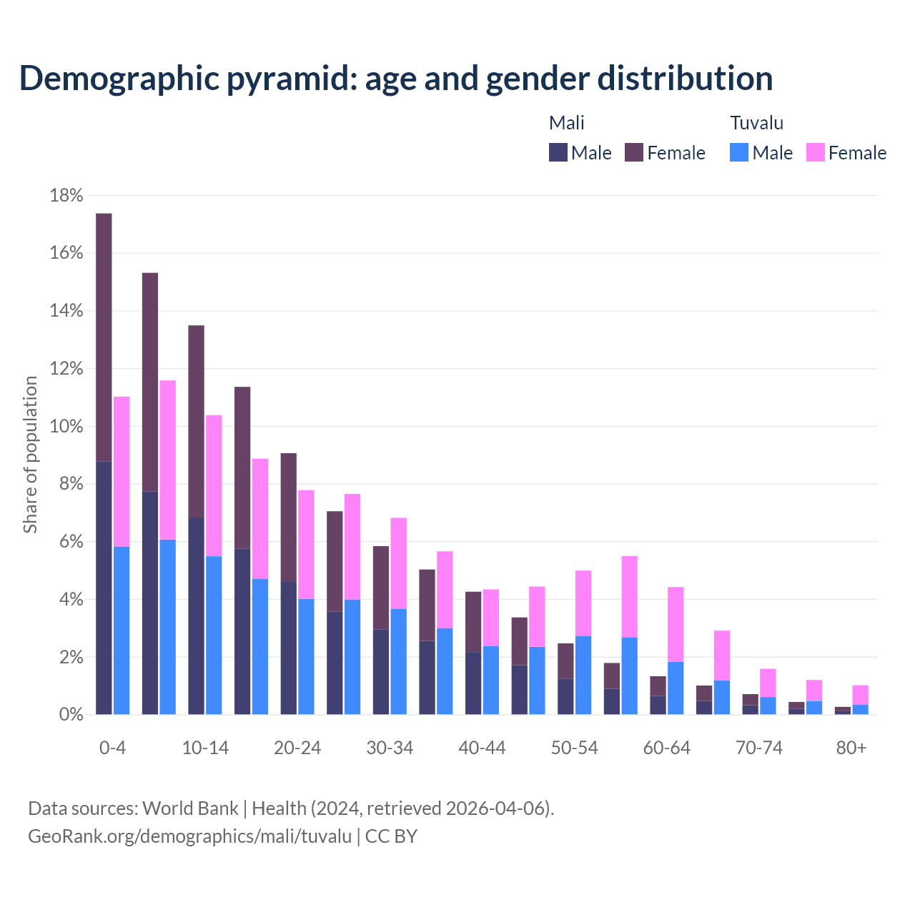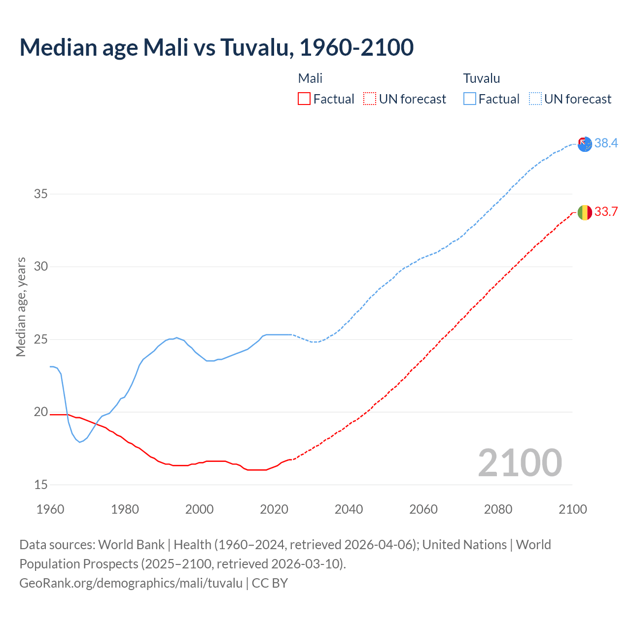 - Mali is ranked 193/196 by median age (oldest to youngest) vs 132/196 for Tuvalu.