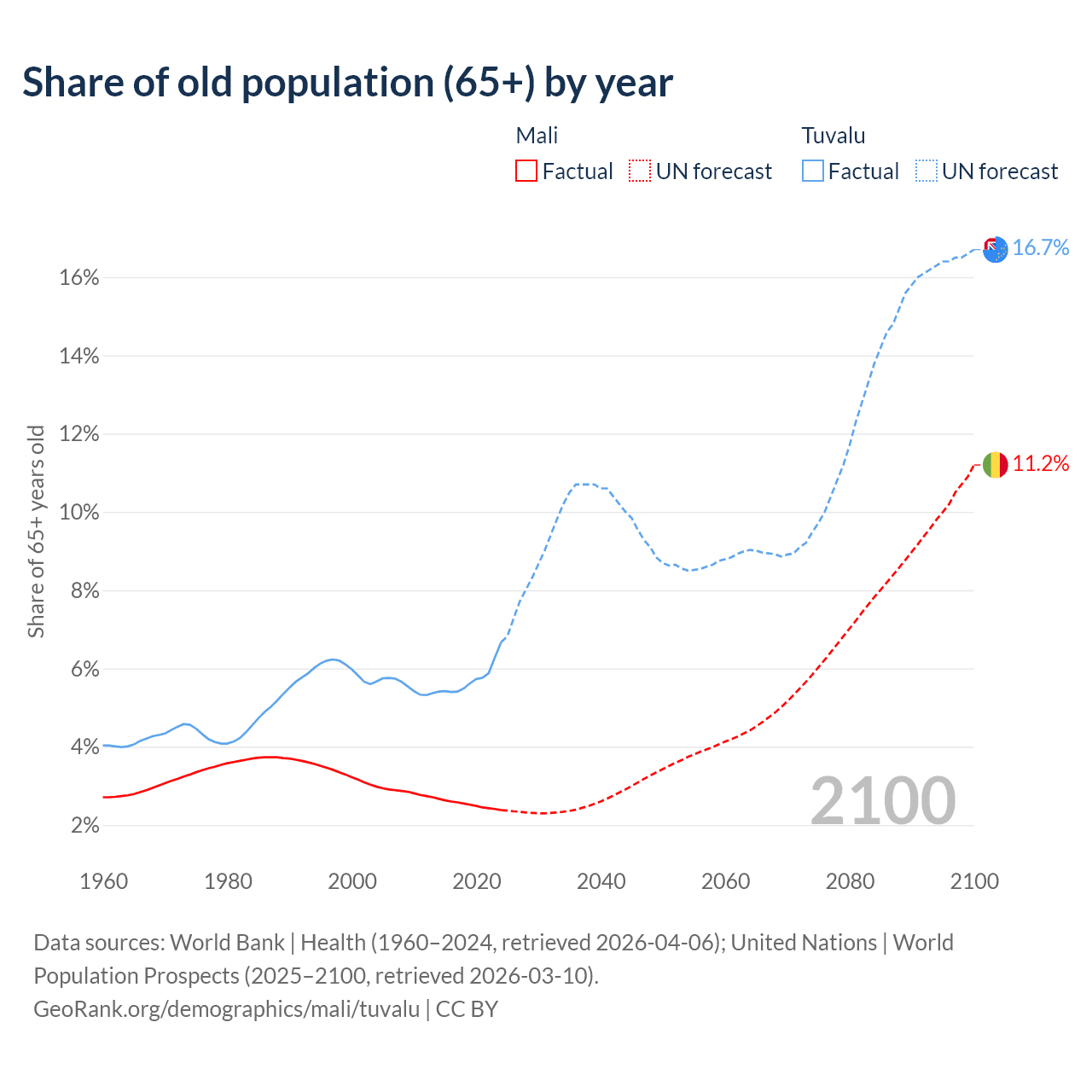 - The share of old-age demographic (65+) in Mali is 2.38% vs 6.67% in Tuvalu.