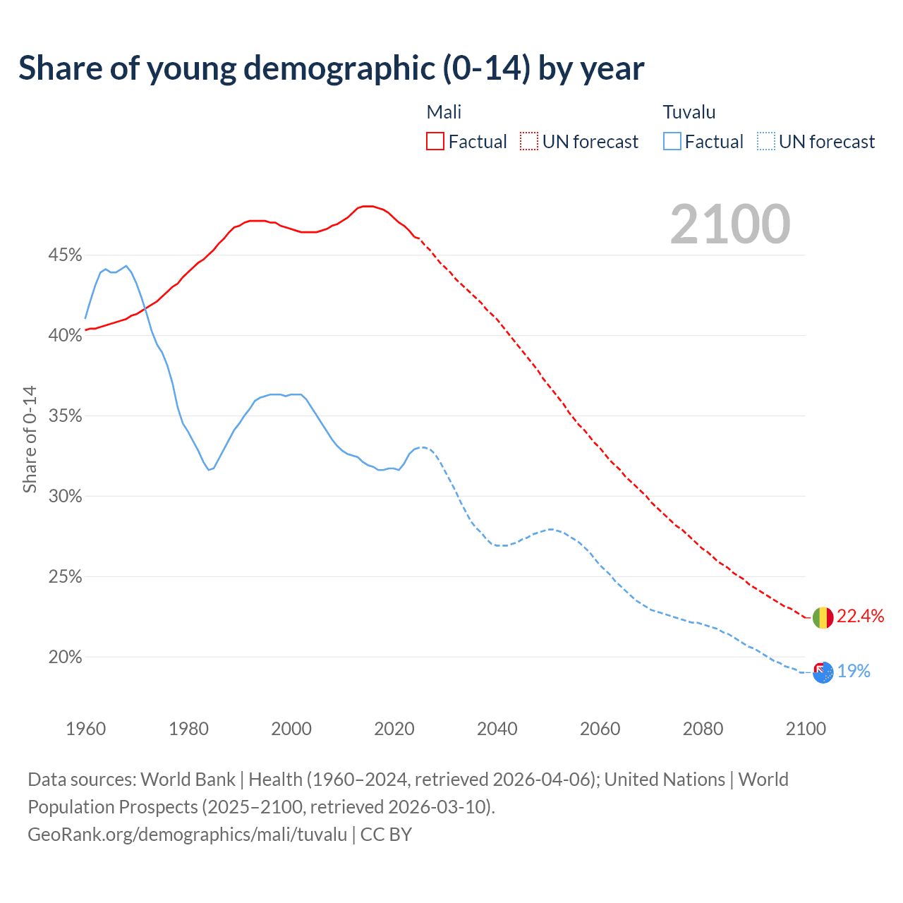 - The share of young demographic (0-15 years old) in Mali is 46.1% vs 32.9% in Tuvalu.