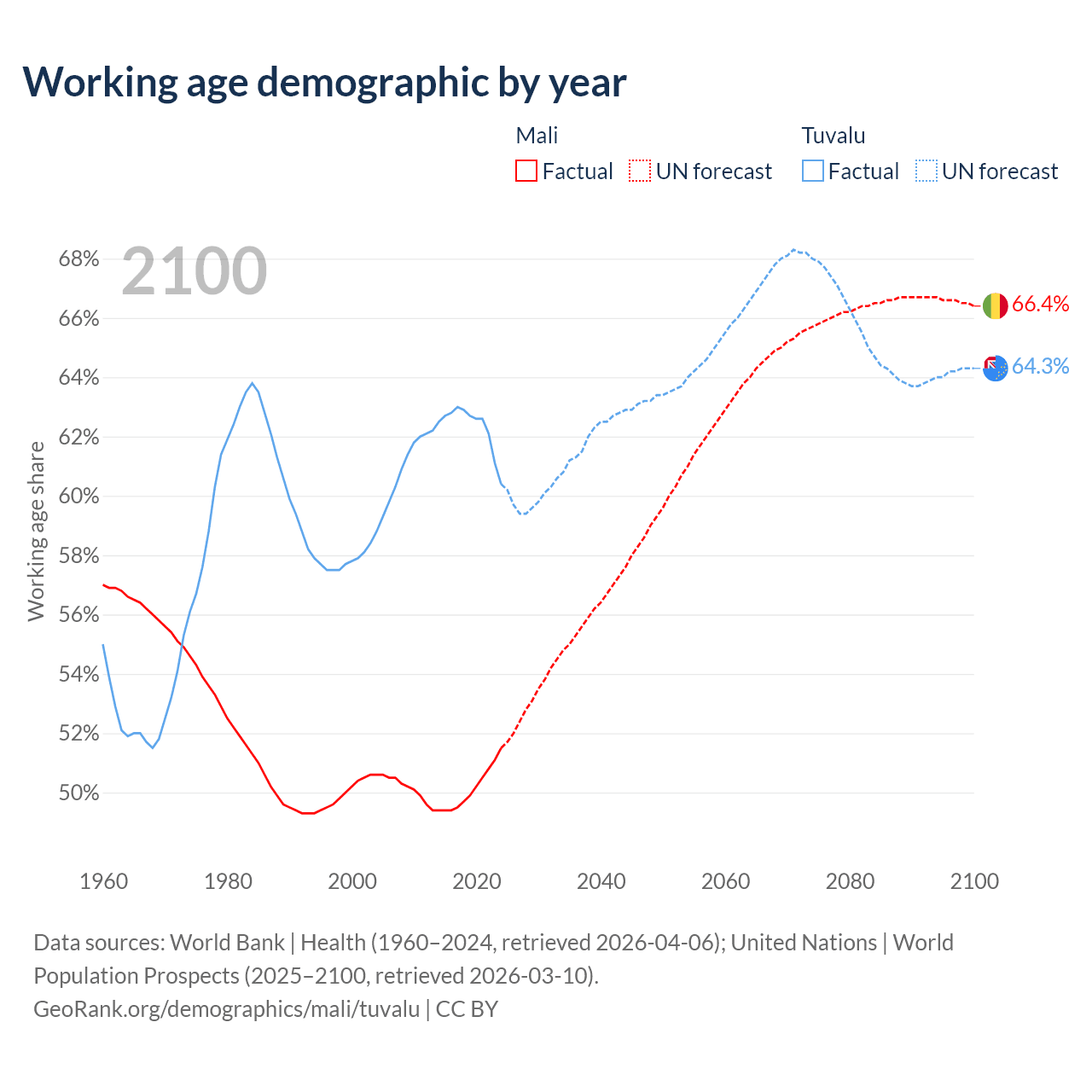- Mali has 13.5M working age adults (aged 15-64) vs 5.64K in Tuvalu.